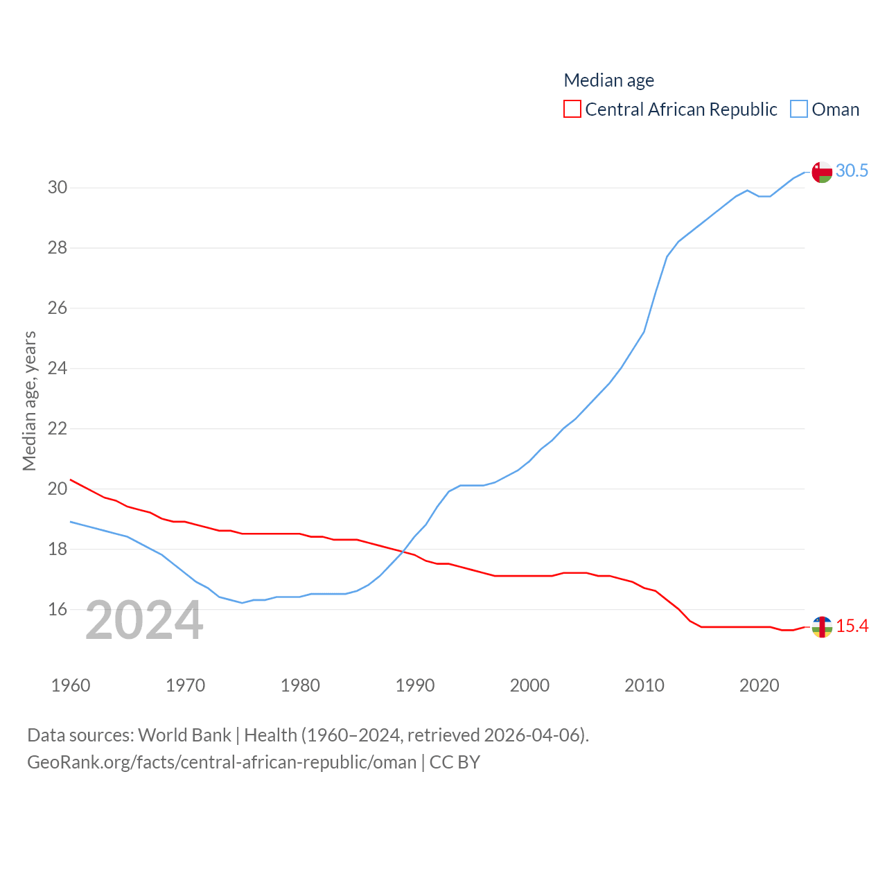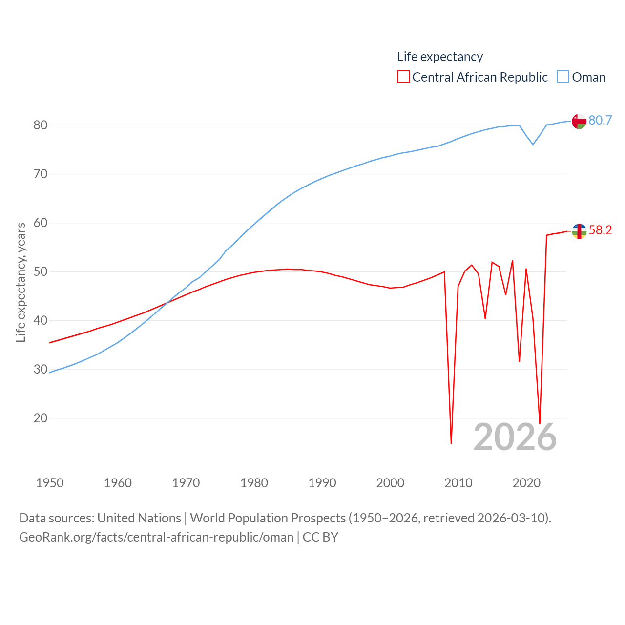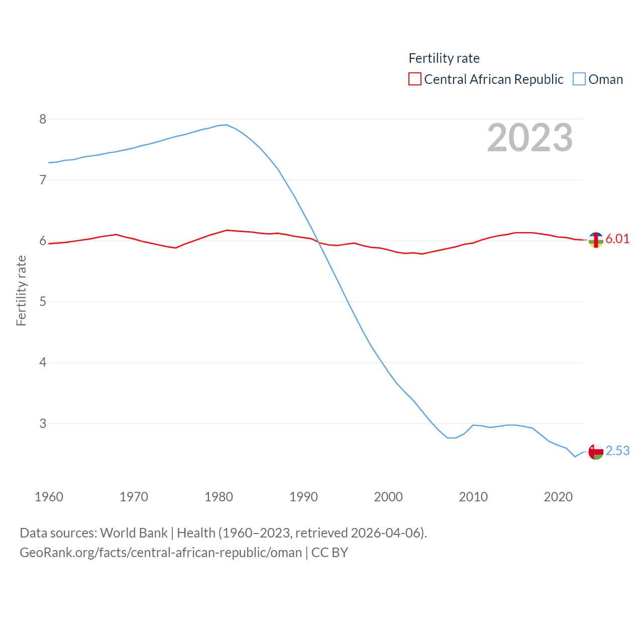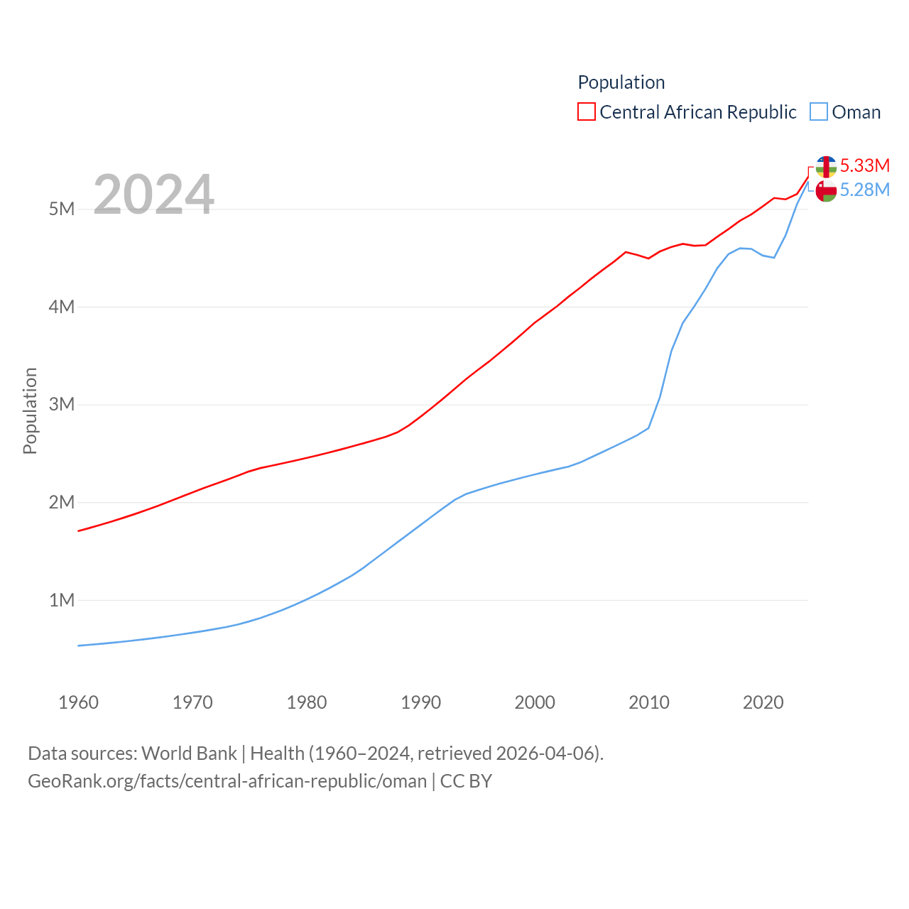 The Central African Republic has a population of 5.33M (ranked 121/197), compared with 5.28M in Oman (ranked 124/197). The Central African Republic's land area is 240,534 sq mi versus 119,499 sq mi for Oman (ranked 43rd vs. 68th).
