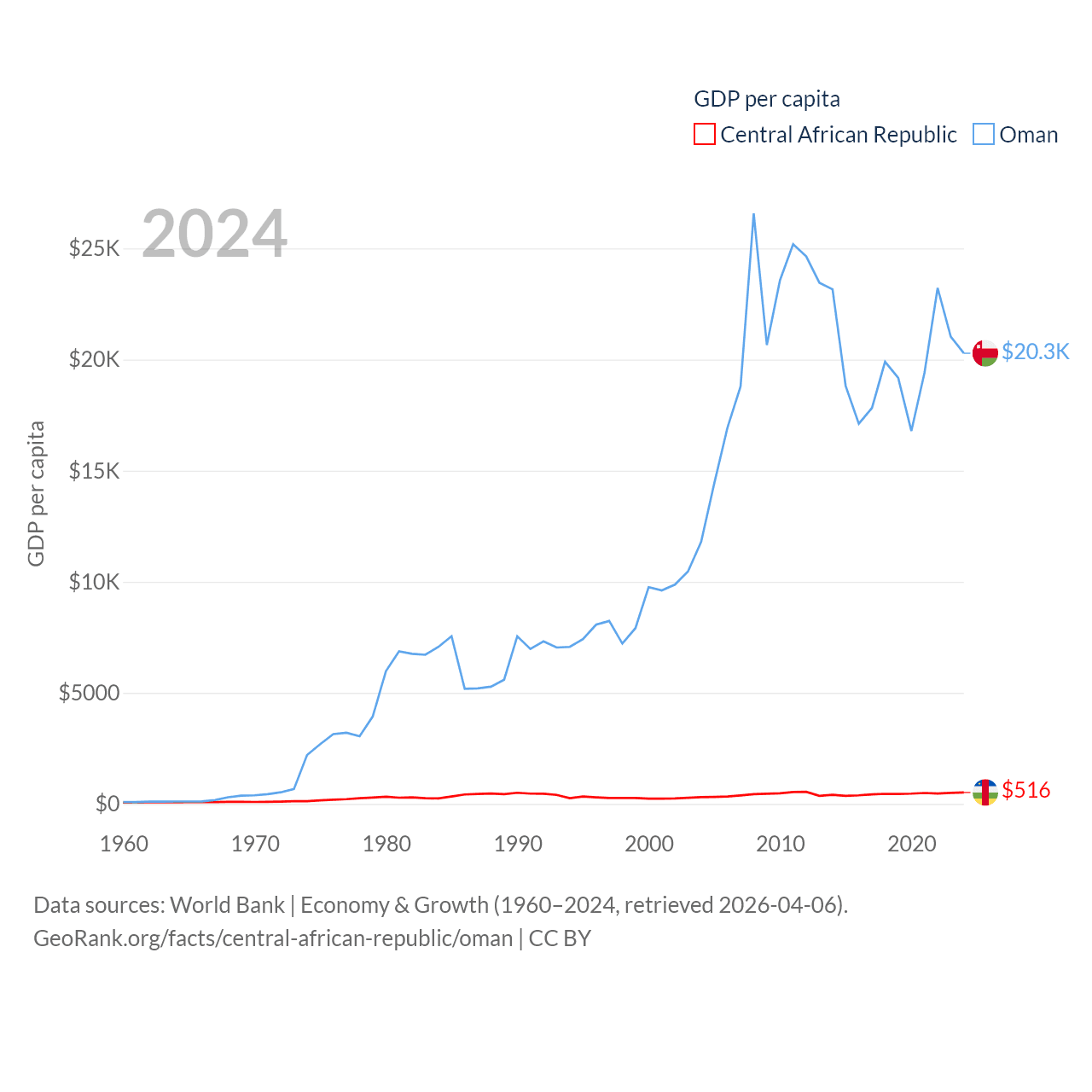 By GDP, The Central African Republic ranks 171/197 ($2.75B) and Oman ranks 70/197 ($107B). By GDP per capita, The Central African Republic ranks 195/197 ($516), while Oman ranks 57/197 ($20,285).