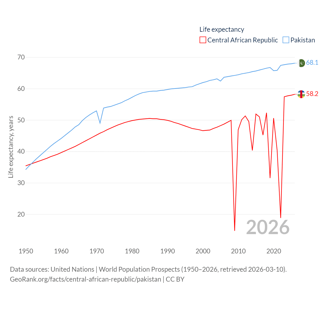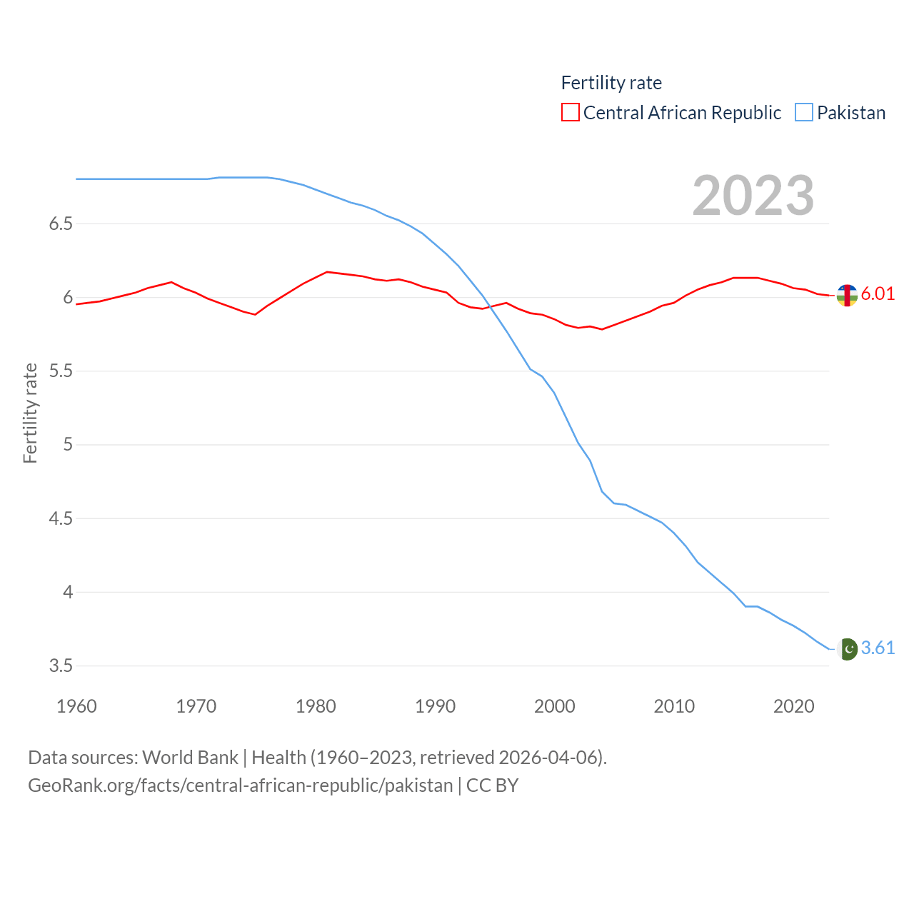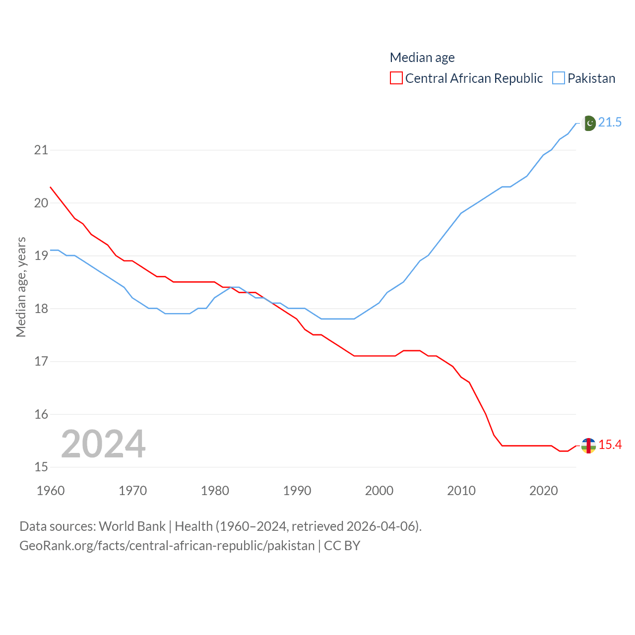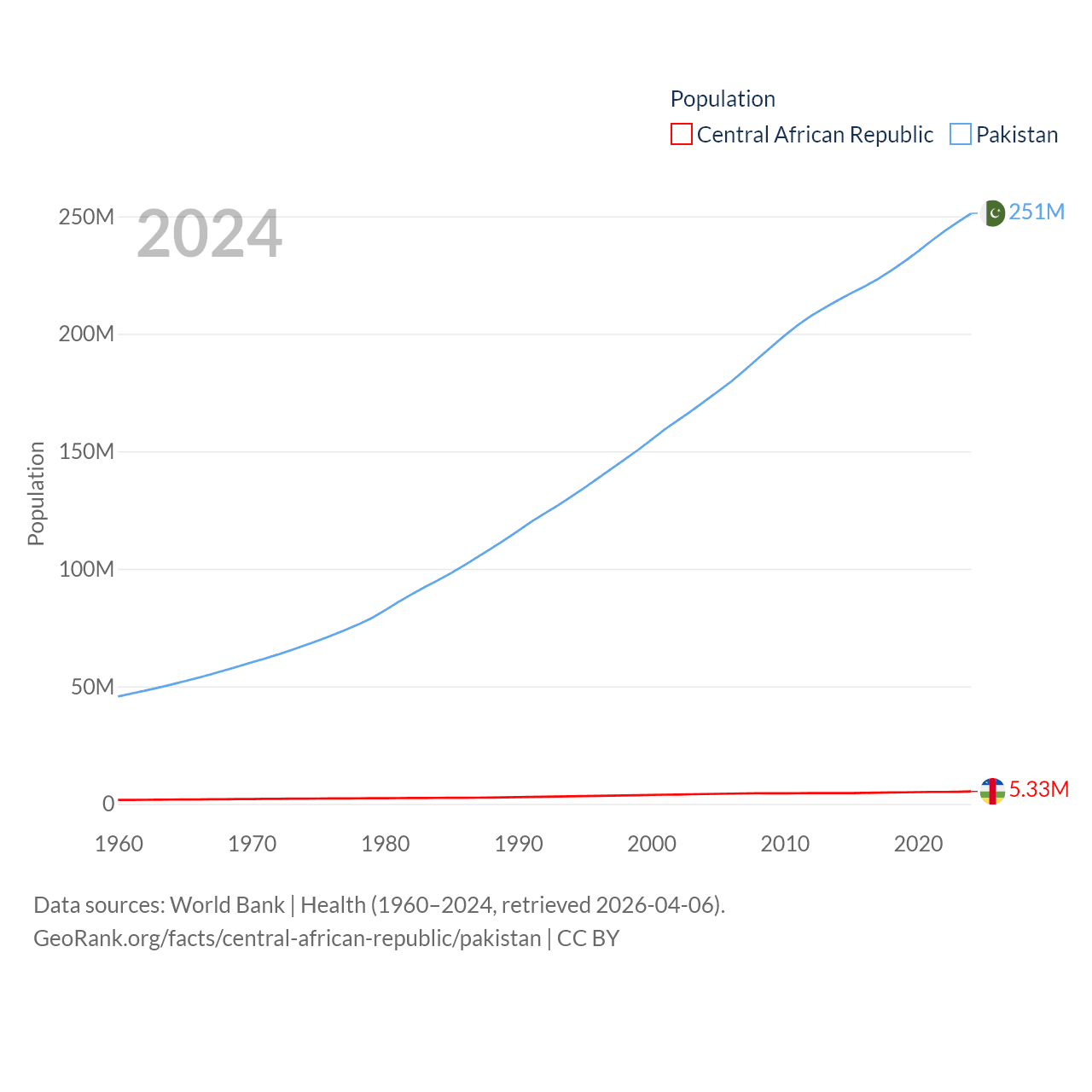 The Central African Republic has a population of 5.33M (ranked 121/197), compared with 251M in Pakistan (ranked 5/197). The Central African Republic's land area is 240,534 sq mi versus 297,638 sq mi for Pakistan (ranked 43rd vs. 35th).