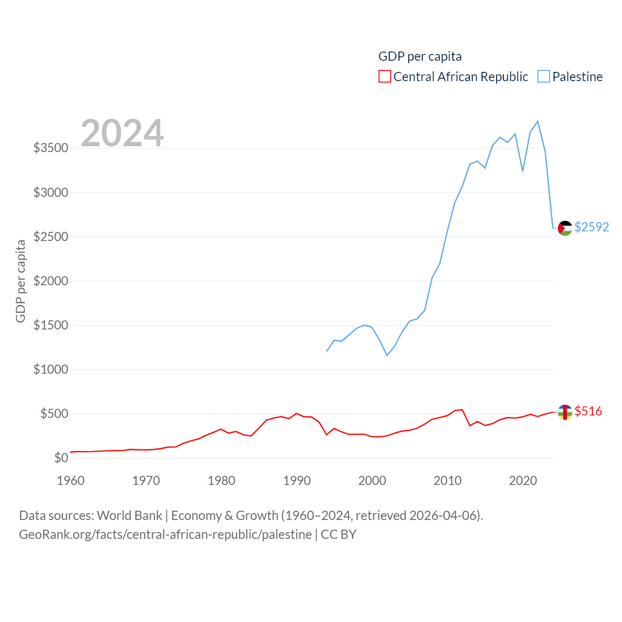 By GDP, The Central African Republic ranks 171/197 ($2.75B) and Palestine ranks 146/197 ($13.7B). By GDP per capita, The Central African Republic ranks 195/197 ($516), while Palestine ranks 147/197 ($2,592).