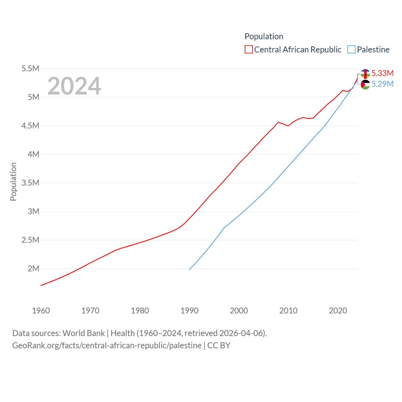 The Central African Republic has a population of 5.33M (ranked 121/197), compared with 5.29M in Palestine (ranked 122/197). The Central African Republic's land area is 240,534 sq mi versus 2,326 sq mi for Palestine (ranked 43rd vs. 164th).