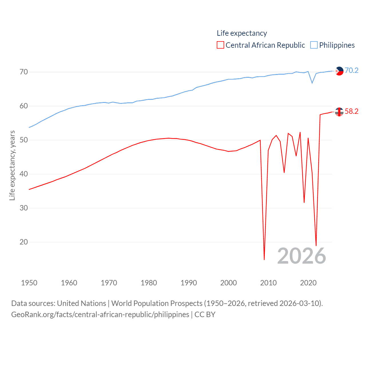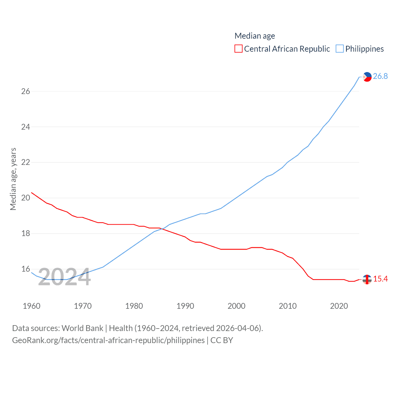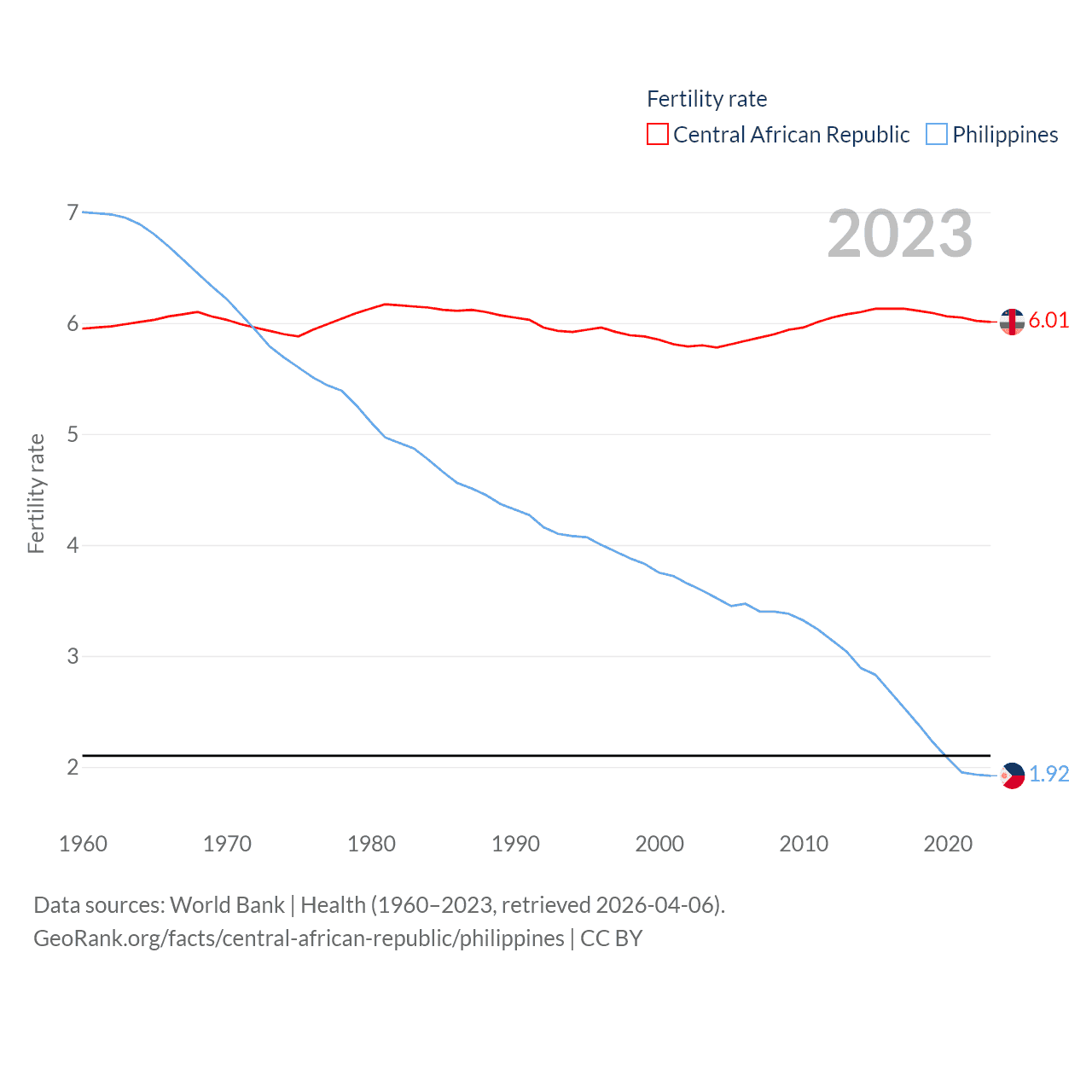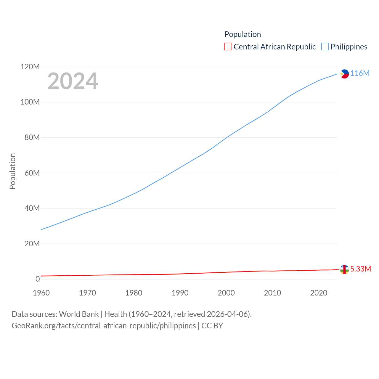 The Central African Republic has a population of 5.33M (ranked 121/197), compared with 116M in The Philippines (ranked 14/197). The Central African Republic's land area is 240,534 sq mi versus 115,124 sq mi for The Philippines (ranked 43rd vs. 71st).