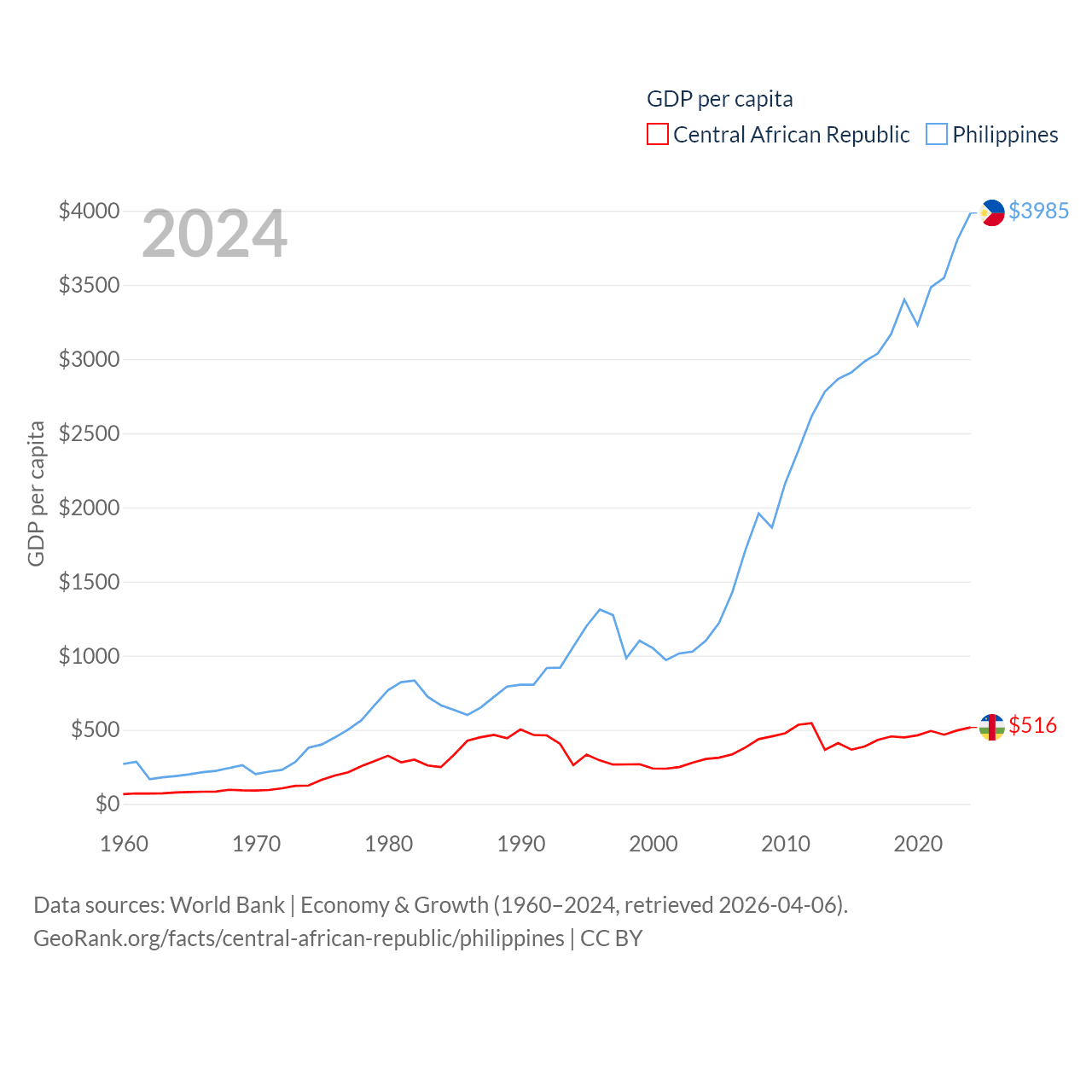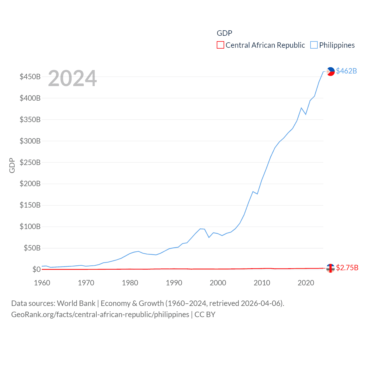 By GDP, The Central African Republic ranks 171/197 ($2.75B) and The Philippines ranks 35/197 ($462B). By GDP per capita, The Central African Republic ranks 195/197 ($516), while The Philippines ranks 130/197 ($3,985).