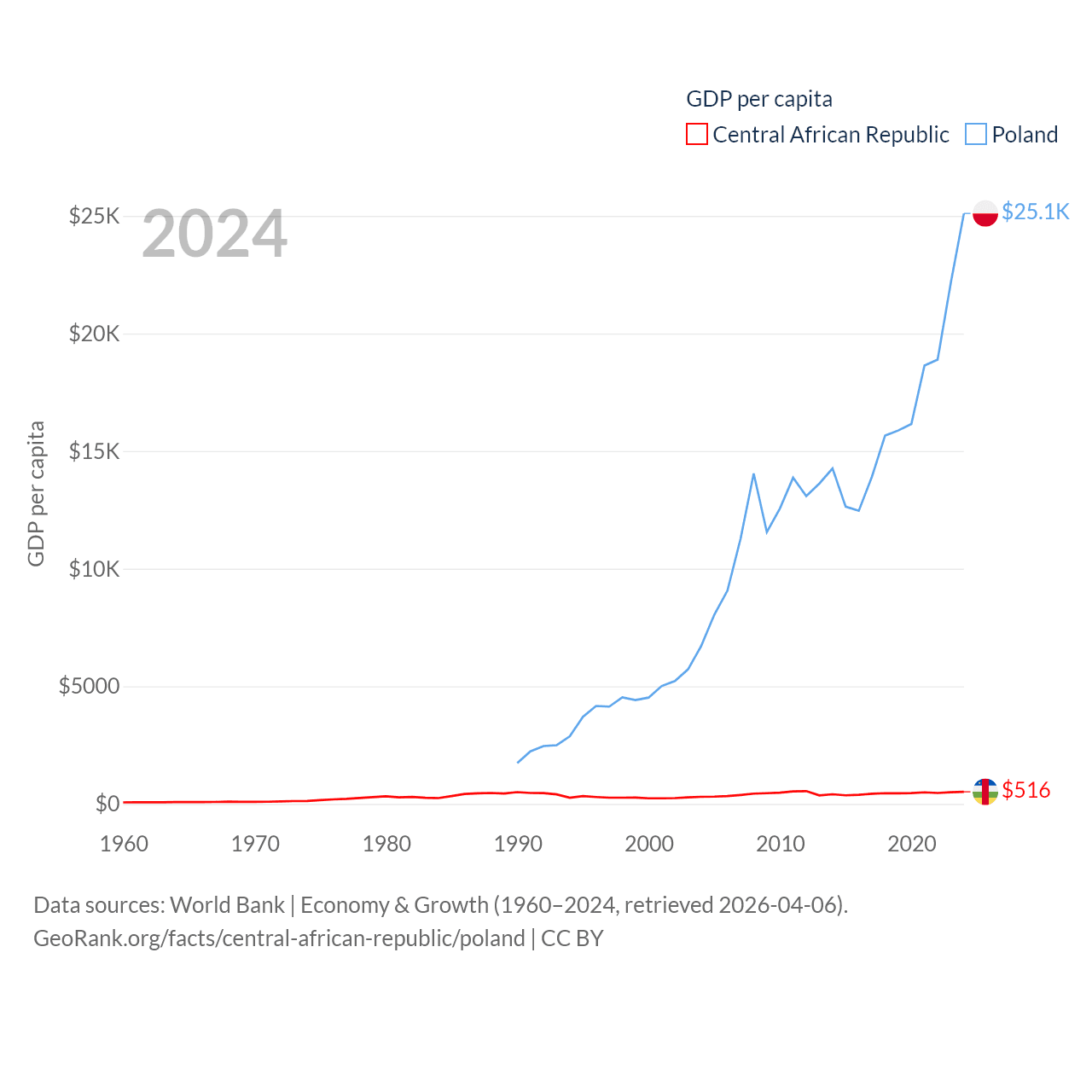 By GDP, The Central African Republic ranks 171/197 ($2.75B) and Poland ranks 21/197 ($918B). By GDP per capita, The Central African Republic ranks 195/197 ($516), while Poland ranks 48/197 ($25,104).
