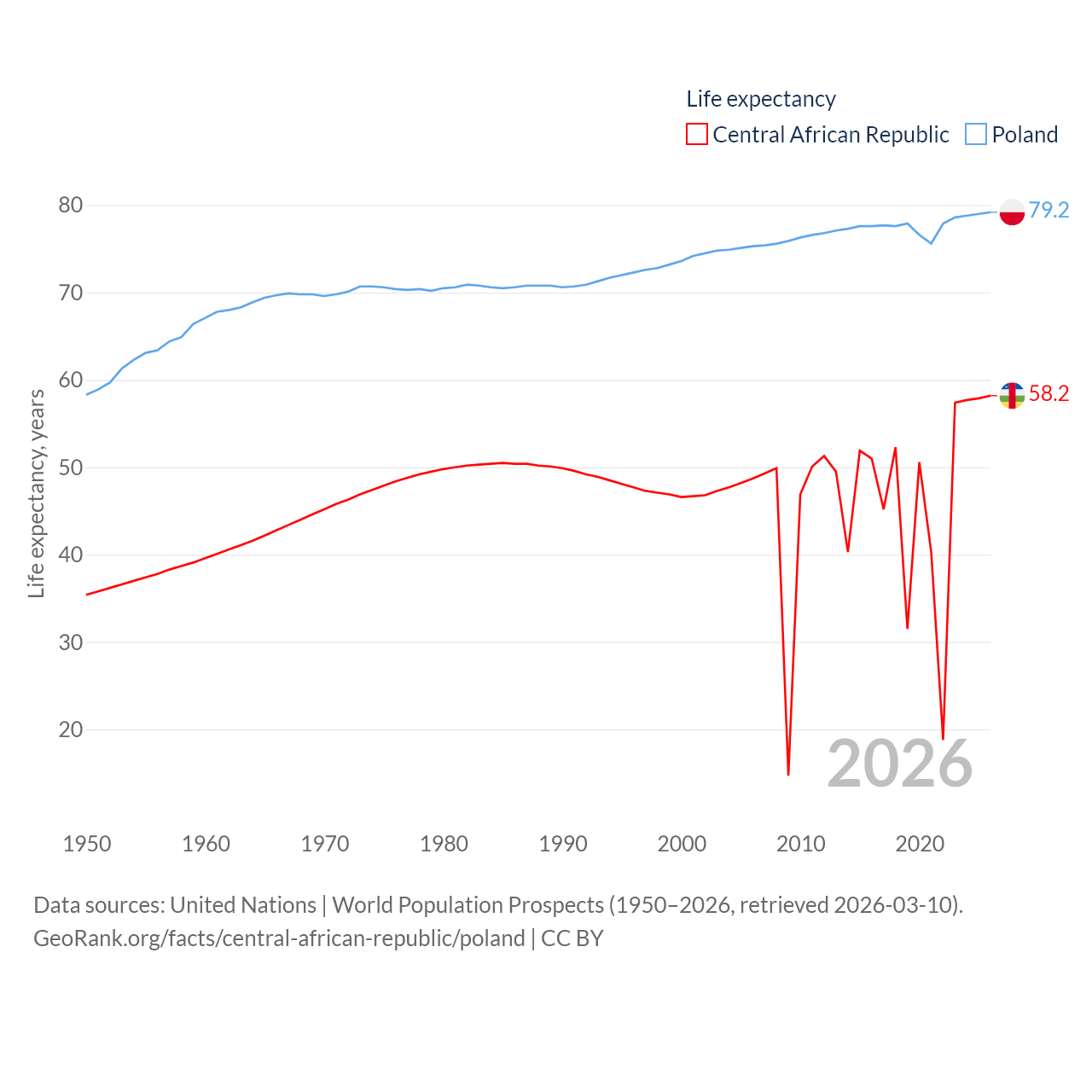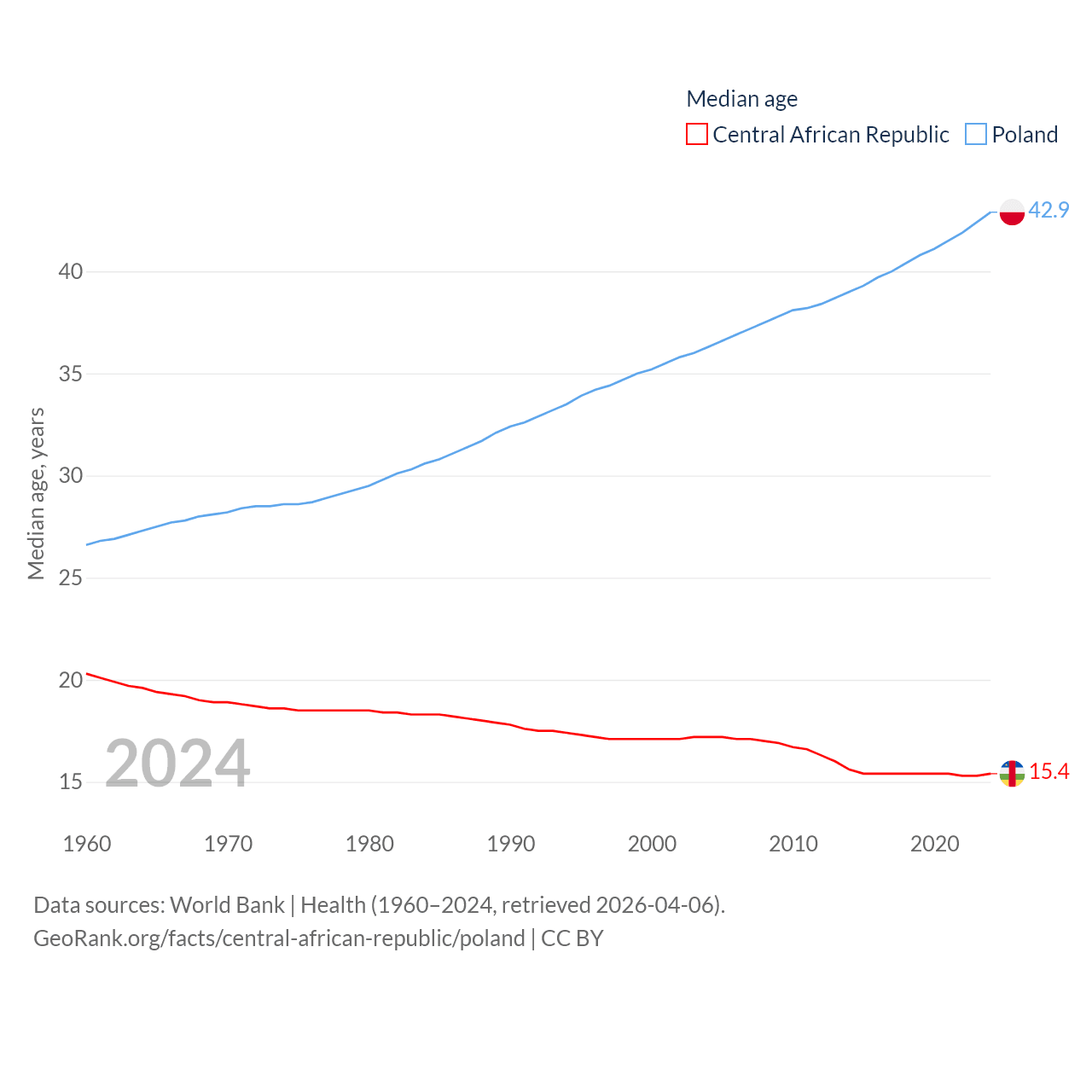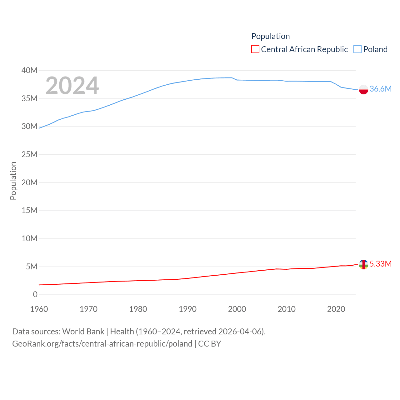The Central African Republic has a population of 5.33M (ranked 121/197), compared with 36.6M in Poland (ranked 42/197). The Central African Republic's land area is 240,534 sq mi versus 118,252 sq mi for Poland (ranked 43rd vs. 69th).