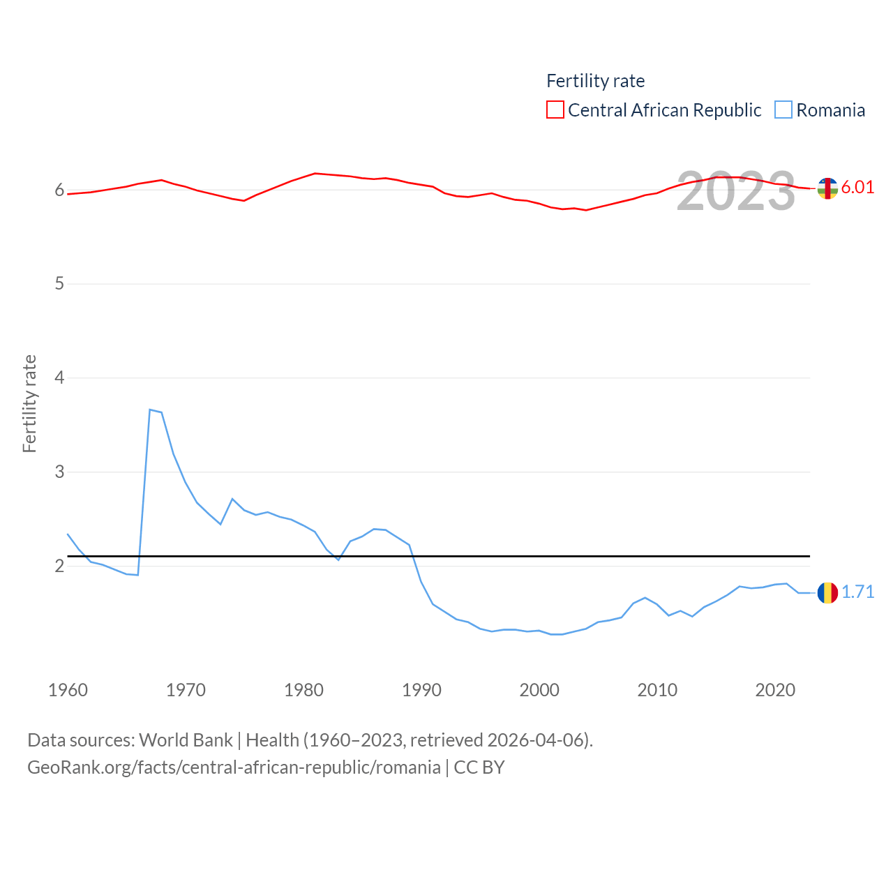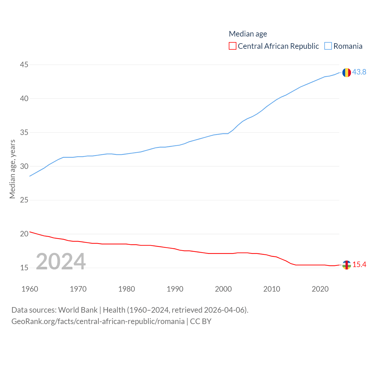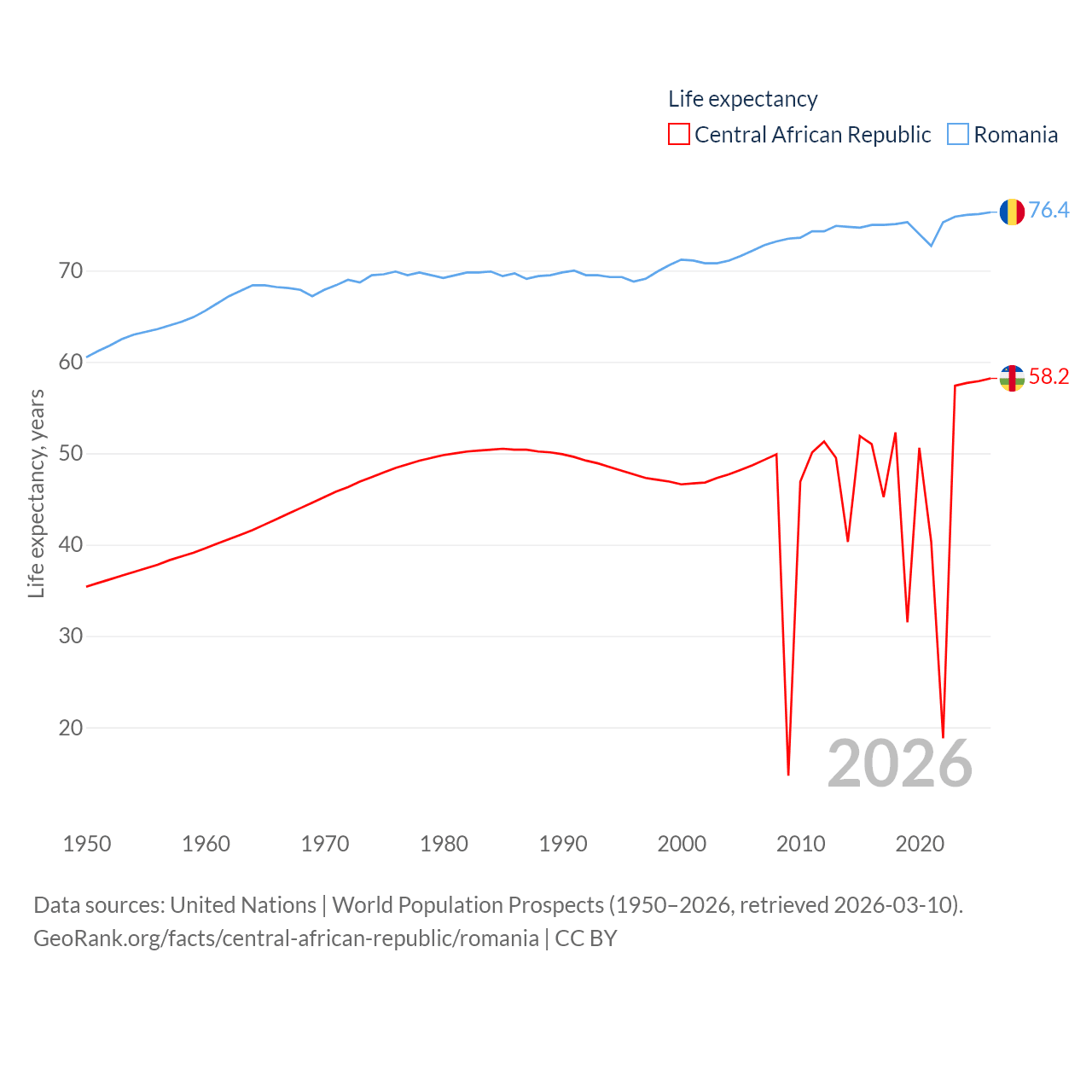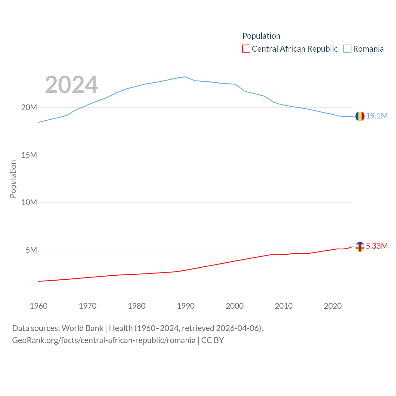 The Central African Republic has a population of 5.33M (ranked 121/197), compared with 19.1M in Romania (ranked 67/197). The Central African Republic's land area is 240,534 sq mi versus 88,834 sq mi for Romania (ranked 43rd vs. 80th).