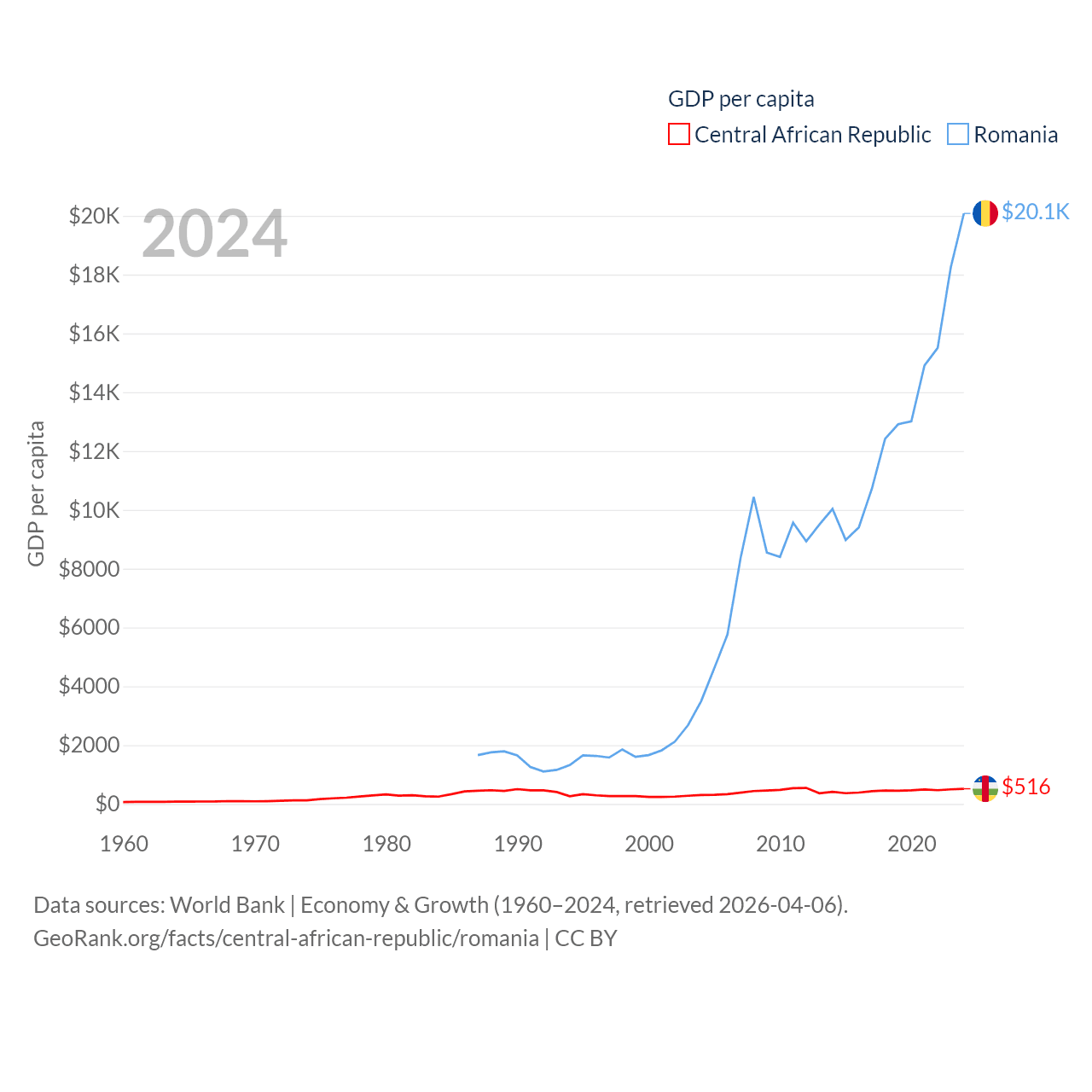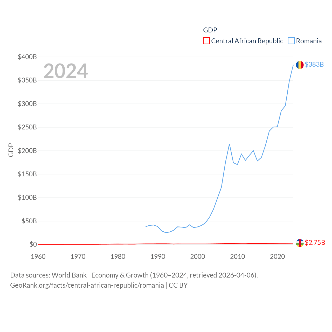 By GDP, The Central African Republic ranks 171/197 ($2.75B) and Romania ranks 42/197 ($383B). By GDP per capita, The Central African Republic ranks 195/197 ($516), while Romania ranks 58/197 ($20,080).