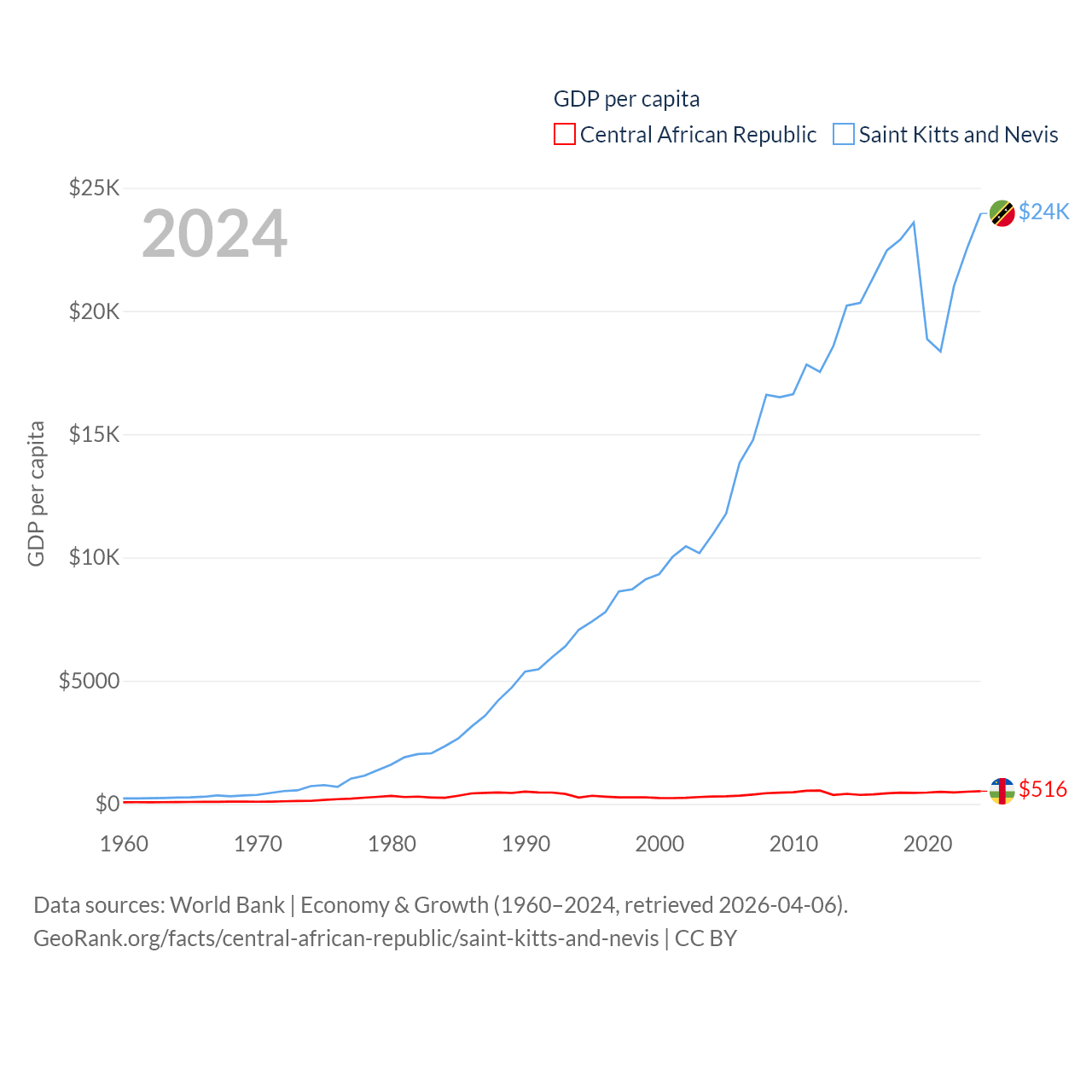 By GDP, The Central African Republic ranks 171/197 ($2.75B) and Saint Kitts and Nevis ranks 187/197 ($1.12B). By GDP per capita, The Central African Republic ranks 195/197 ($516), while Saint Kitts and Nevis ranks 51/197 ($23,961).