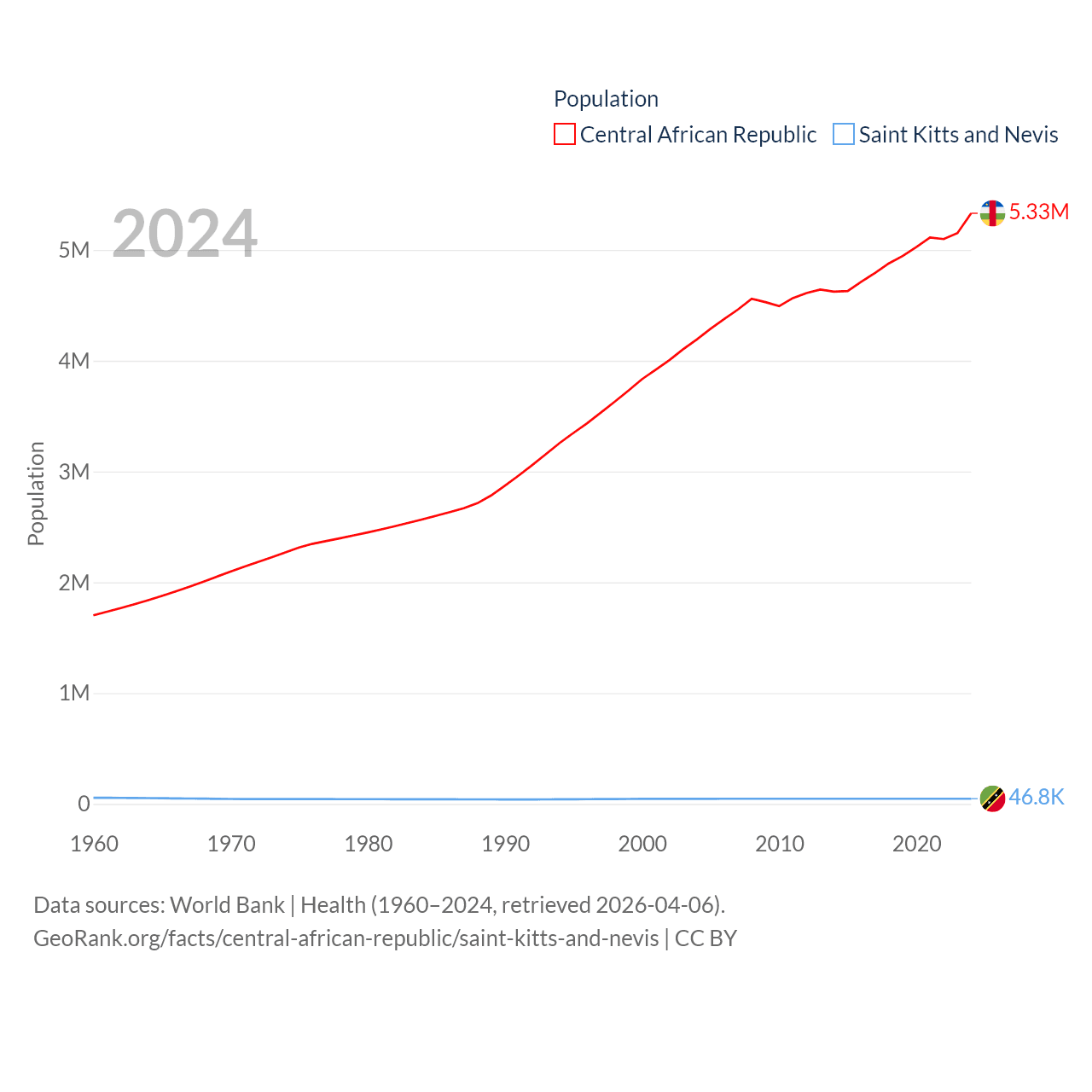 The Central African Republic has a population of 5.33M (ranked 121/197), compared with 46.8K in Saint Kitts and Nevis (ranked 189/197). The Central African Republic's land area is 240,534 sq mi versus 100.4 sq mi for Saint Kitts and Nevis (ranked 43rd vs. 189th).
