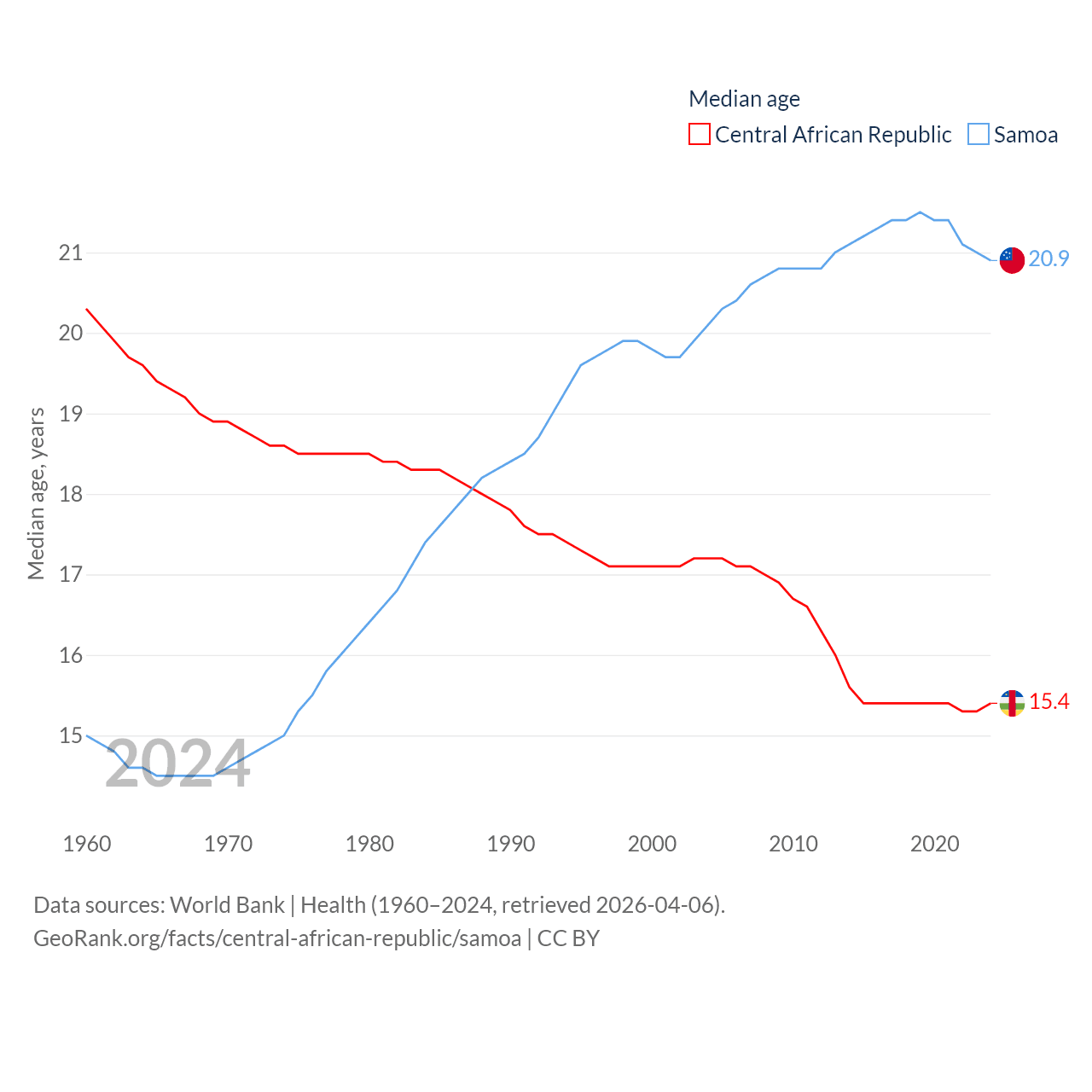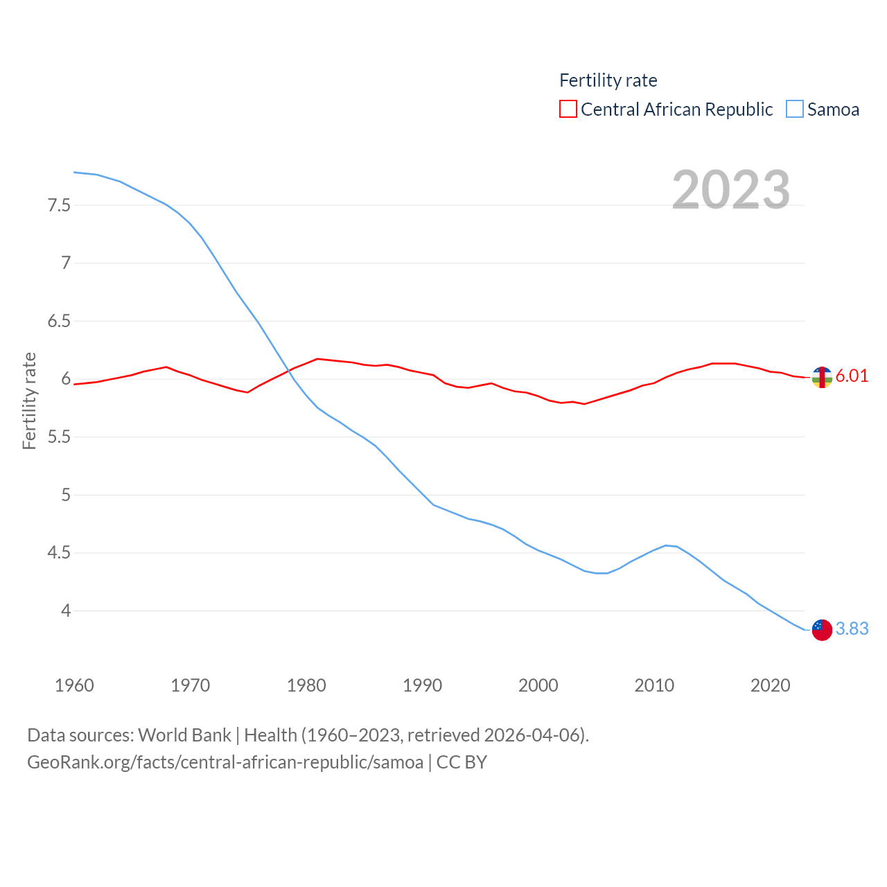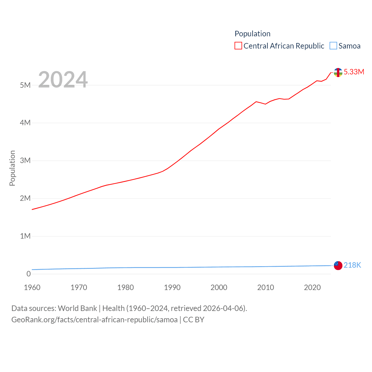 The Central African Republic has a population of 5.33M (ranked 121/197), compared with 218K in Samoa (ranked 177/197). The Central African Republic's land area is 240,534 sq mi versus 1,073 sq mi for Samoa (ranked 43rd vs. 168th).