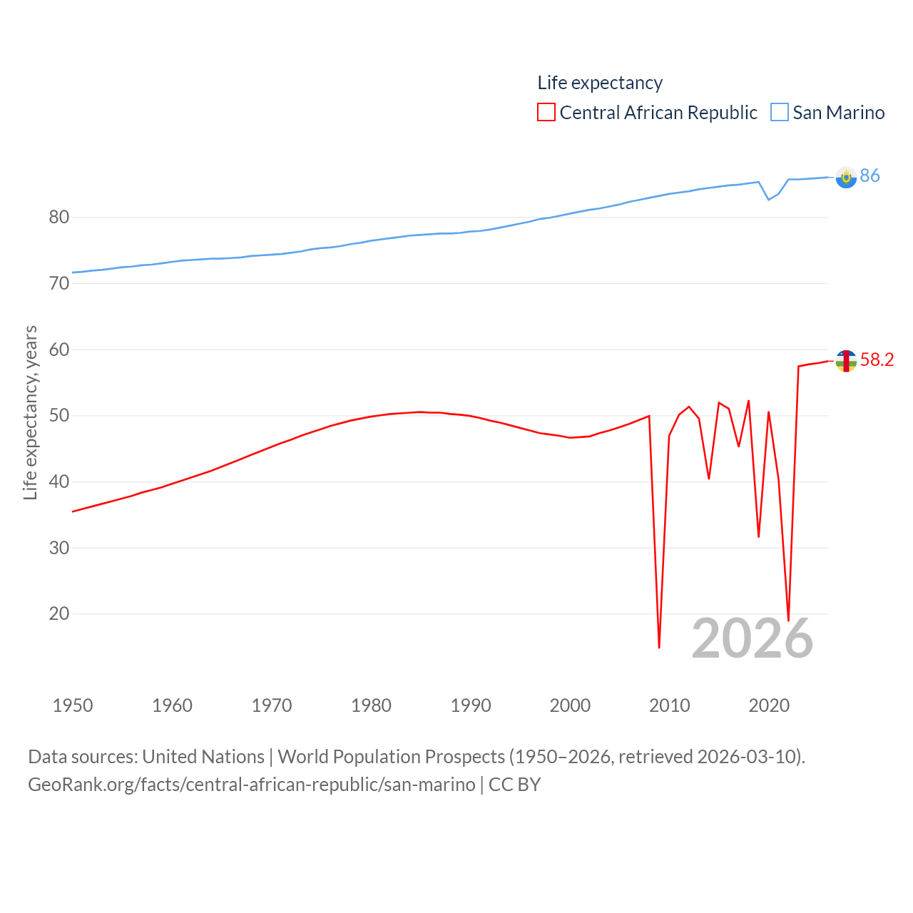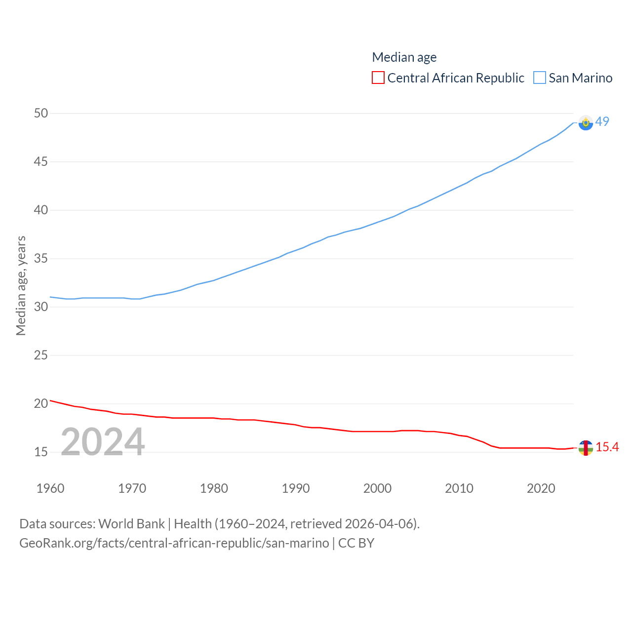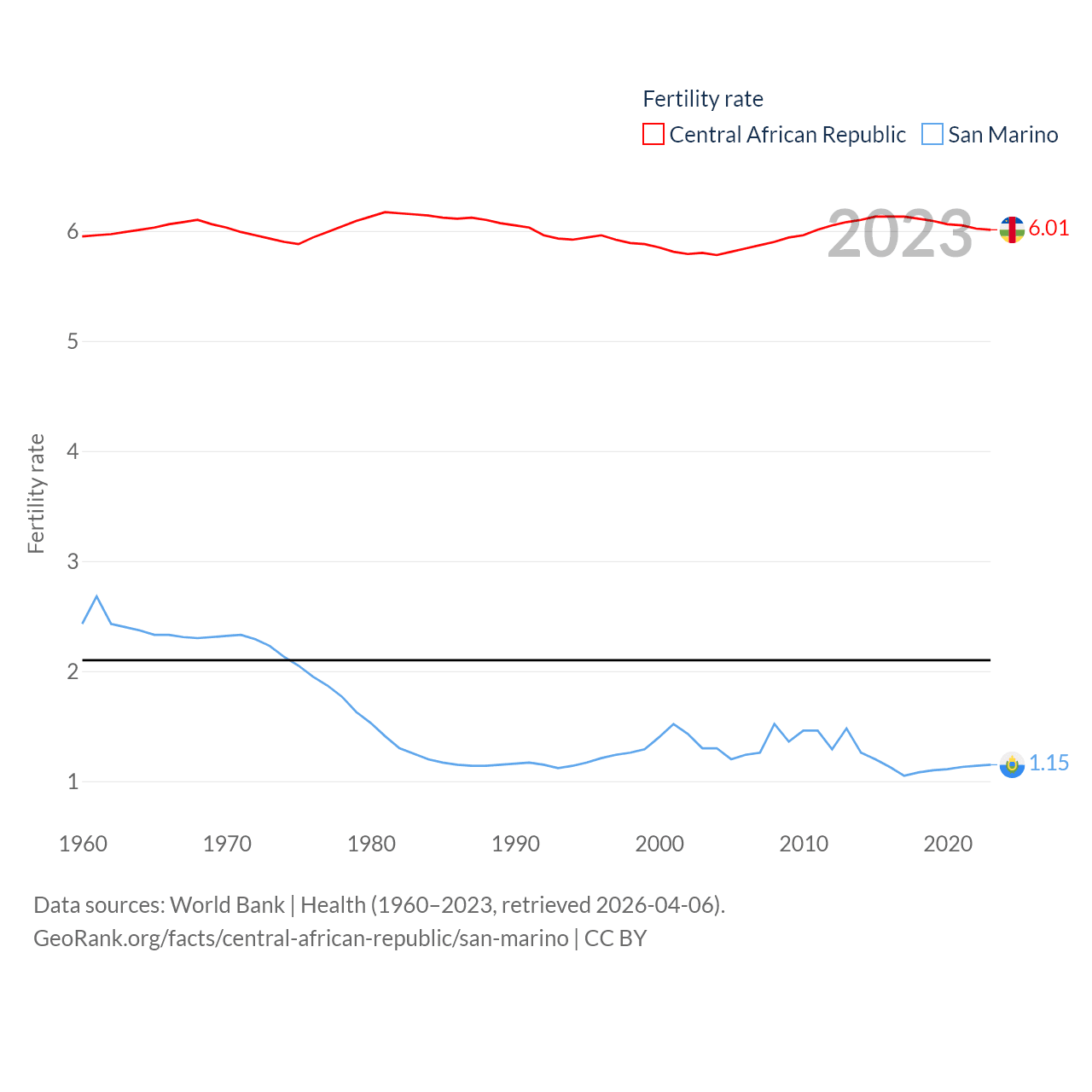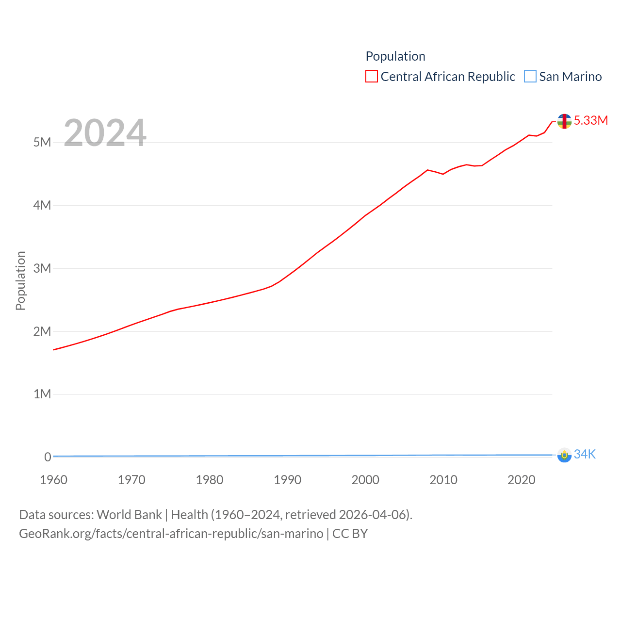 The Central African Republic has a population of 5.33M (ranked 121/197), compared with 34K in San Marino (ranked 193/197). The Central African Republic's land area is 240,534 sq mi versus 23.2 sq mi for San Marino (ranked 43rd vs. 193rd).