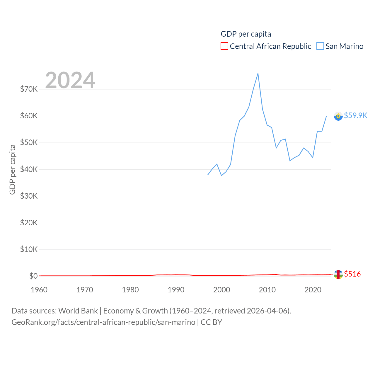By GDP, The Central African Republic ranks 171/197 ($2.75B) and San Marino ranks 180/197 ($2.03B). By GDP per capita, The Central African Republic ranks 195/197 ($516), while San Marino ranks 15/197 ($59,880).