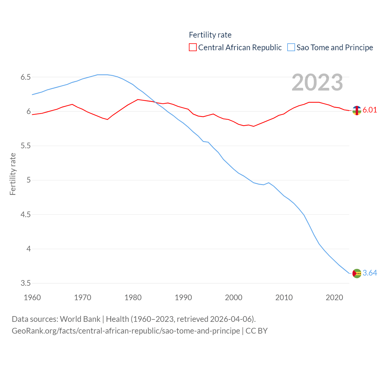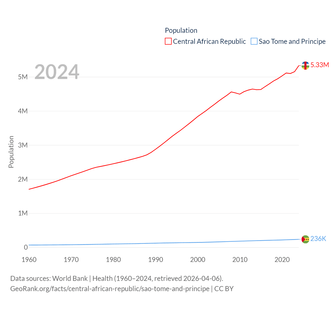 The Central African Republic has a population of 5.33M (ranked 121/197), compared with 236K in Sao Tome and Principe (ranked 176/197). The Central African Republic's land area is 240,534 sq mi versus 371 sq mi for Sao Tome and Principe (ranked 43rd vs. 172nd).