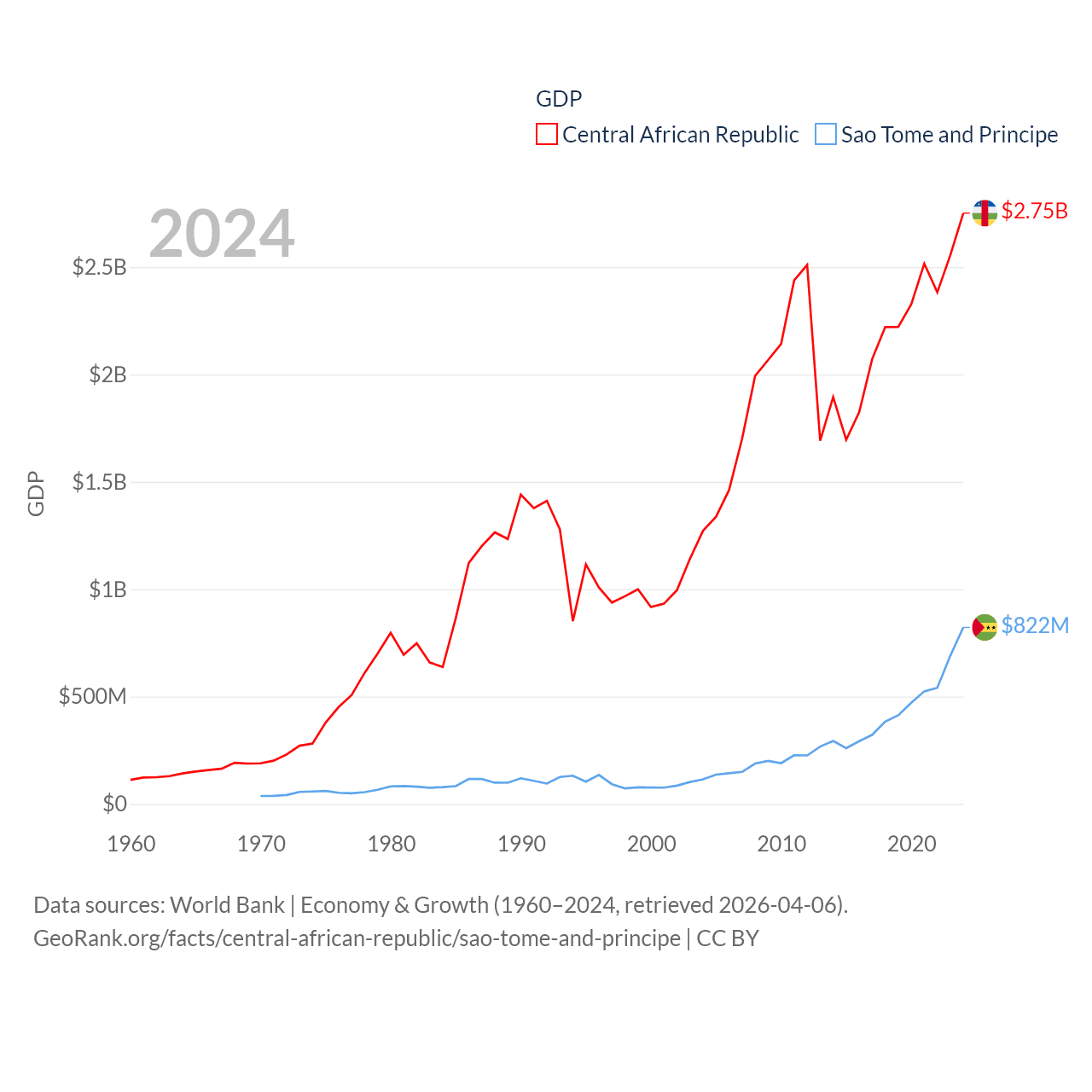 By GDP, The Central African Republic ranks 171/197 ($2.75B) and Sao Tome and Principe ranks 189/197 ($822M). By GDP per capita, The Central African Republic ranks 195/197 ($516), while Sao Tome and Principe ranks 134/197 ($3,491).