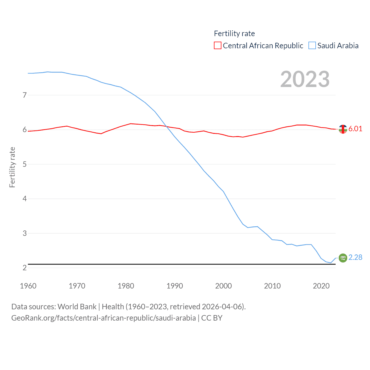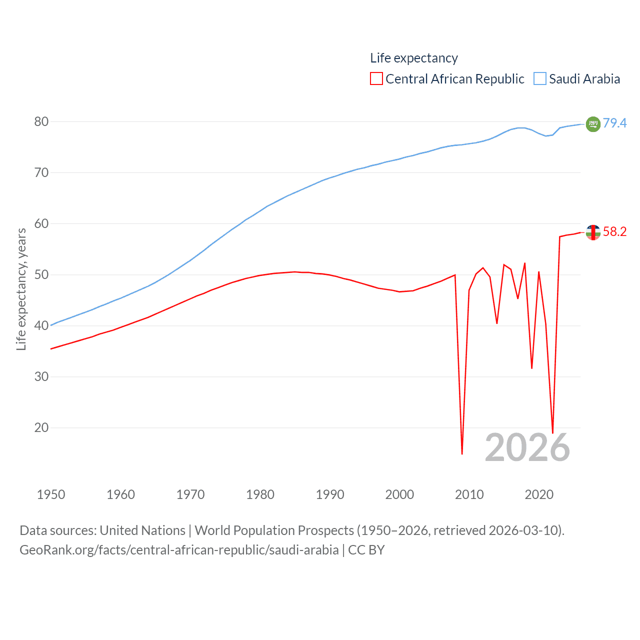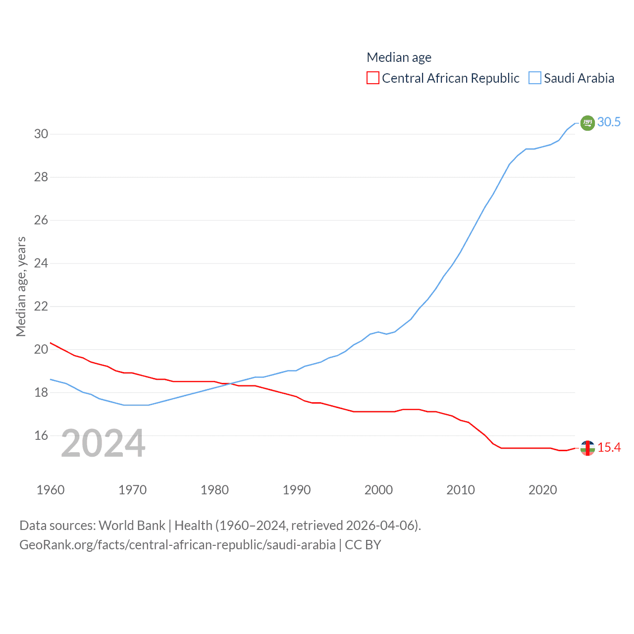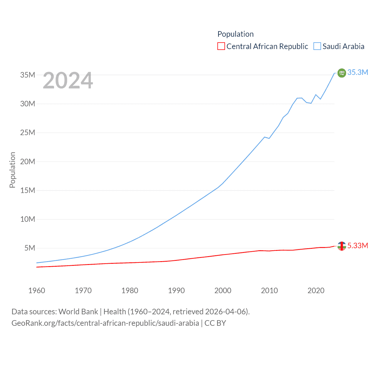 The Central African Republic has a population of 5.33M (ranked 121/197), compared with 35.3M in Saudi Arabia (ranked 45/197). The Central African Republic's land area is 240,534 sq mi versus 830,000 sq mi for Saudi Arabia (ranked 43rd vs. 12th).