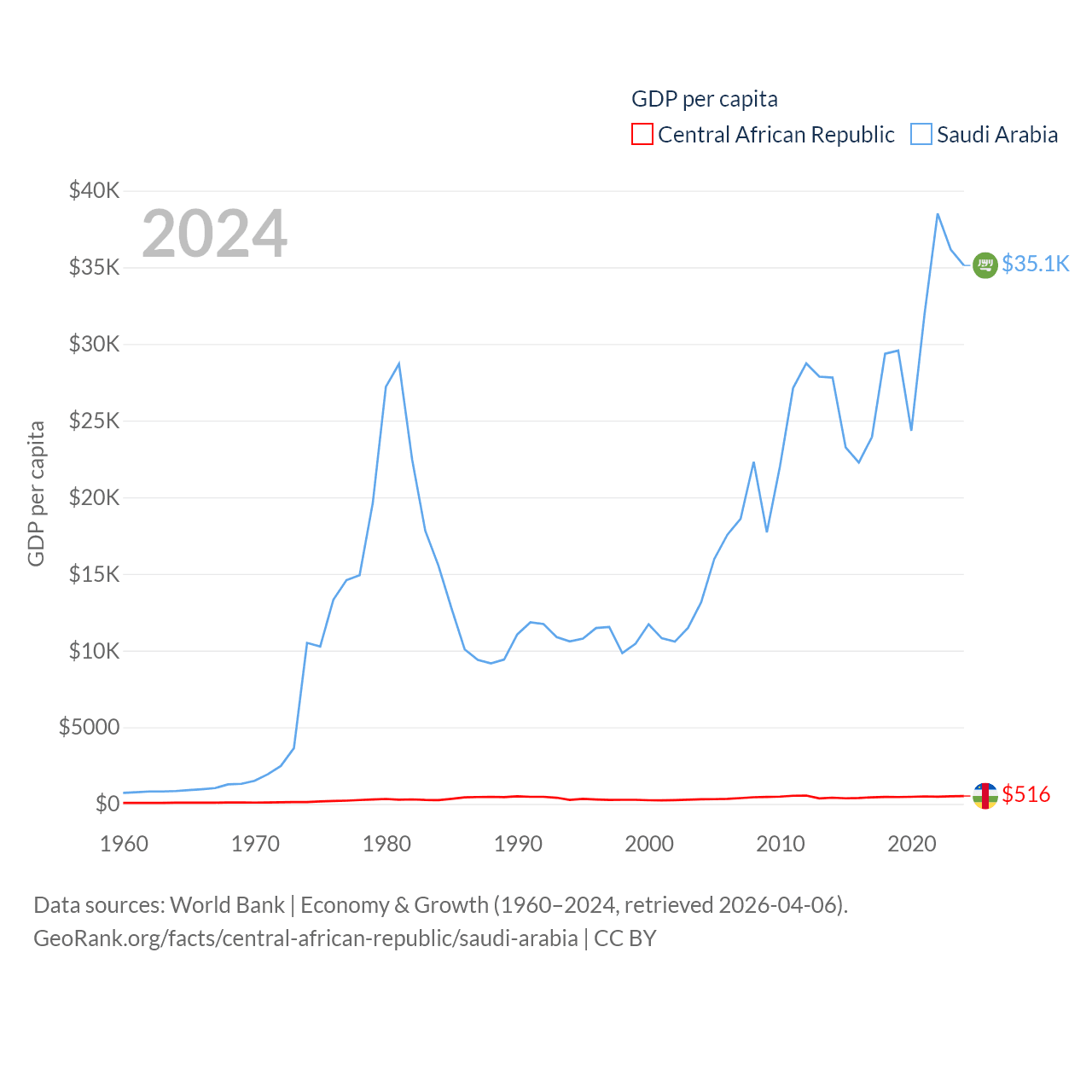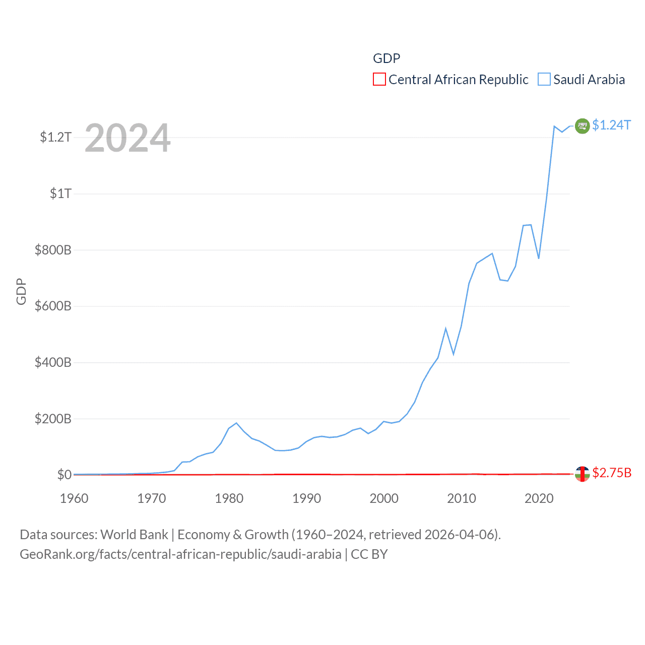By GDP, The Central African Republic ranks 171/197 ($2.75B) and Saudi Arabia ranks 18/197 ($1.24T). By GDP per capita, The Central African Republic ranks 195/197 ($516), while Saudi Arabia ranks 33/197 ($35,122).