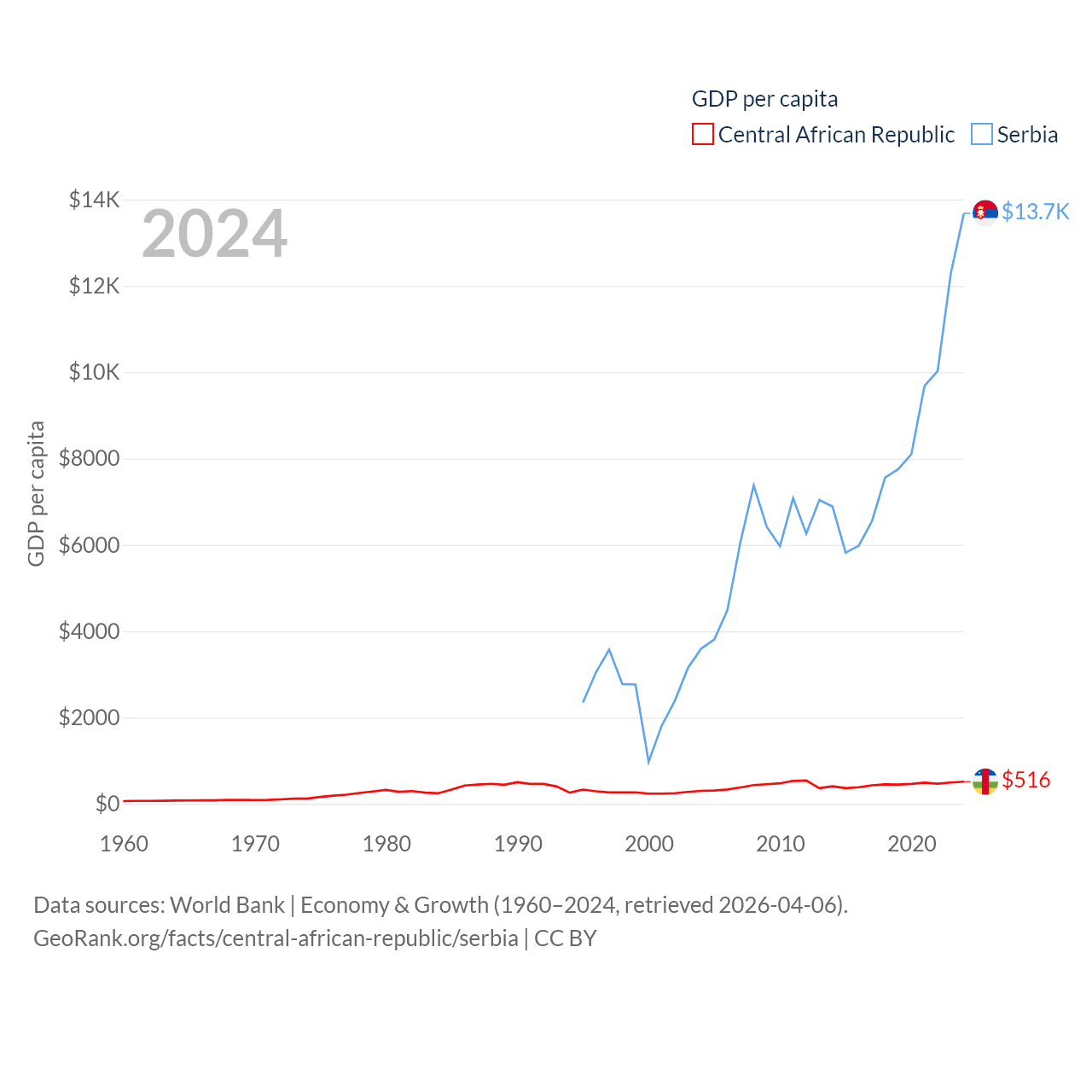 By GDP, The Central African Republic ranks 171/197 ($2.75B) and Serbia ranks 76/197 ($90.1B). By GDP per capita, The Central African Republic ranks 195/197 ($516), while Serbia ranks 73/197 ($13,679).