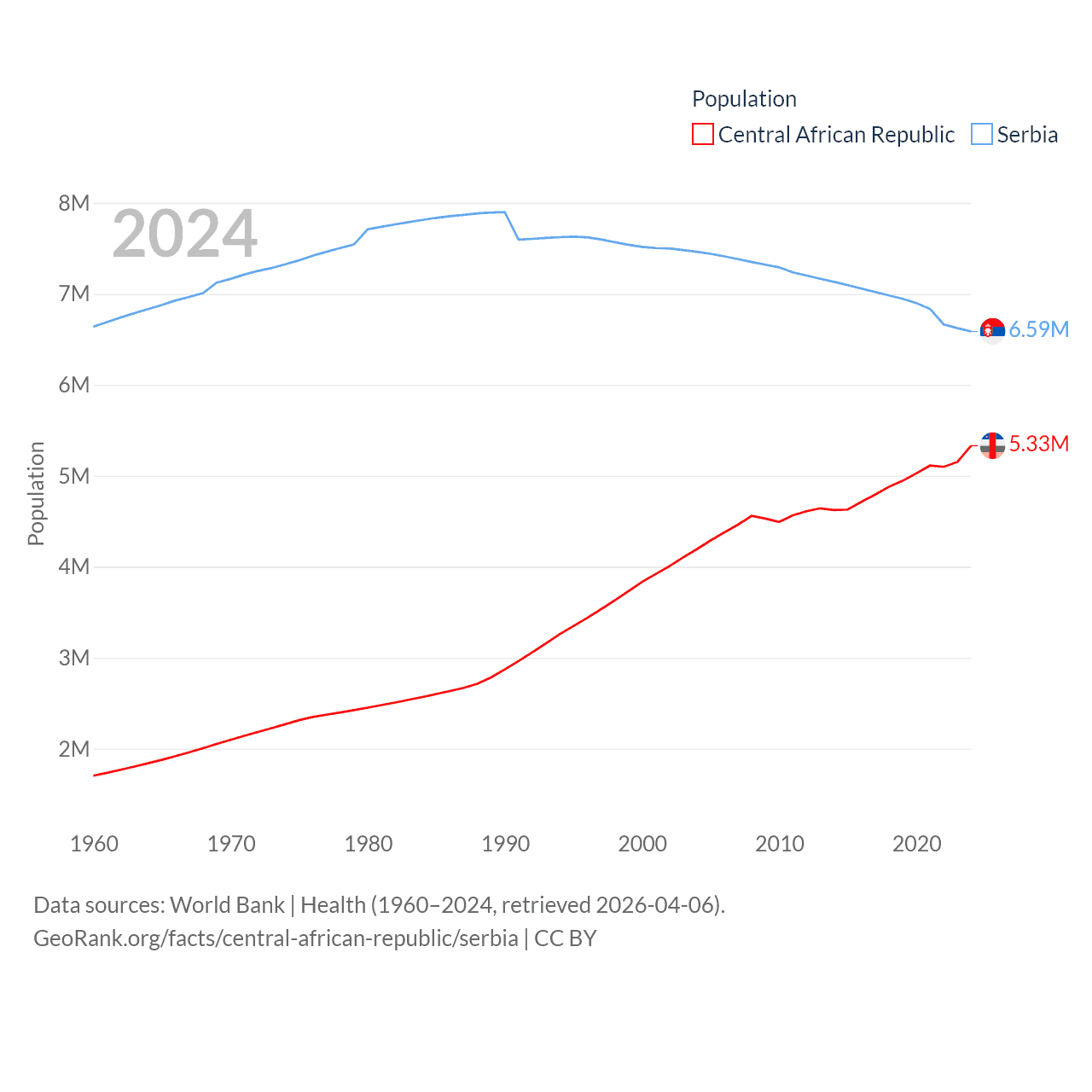 The Central African Republic has a population of 5.33M (ranked 121/197), compared with 6.59M in Serbia (ranked 109/197). The Central African Republic's land area is 240,534 sq mi versus 32,467 sq mi for Serbia (ranked 43rd vs. 111th).