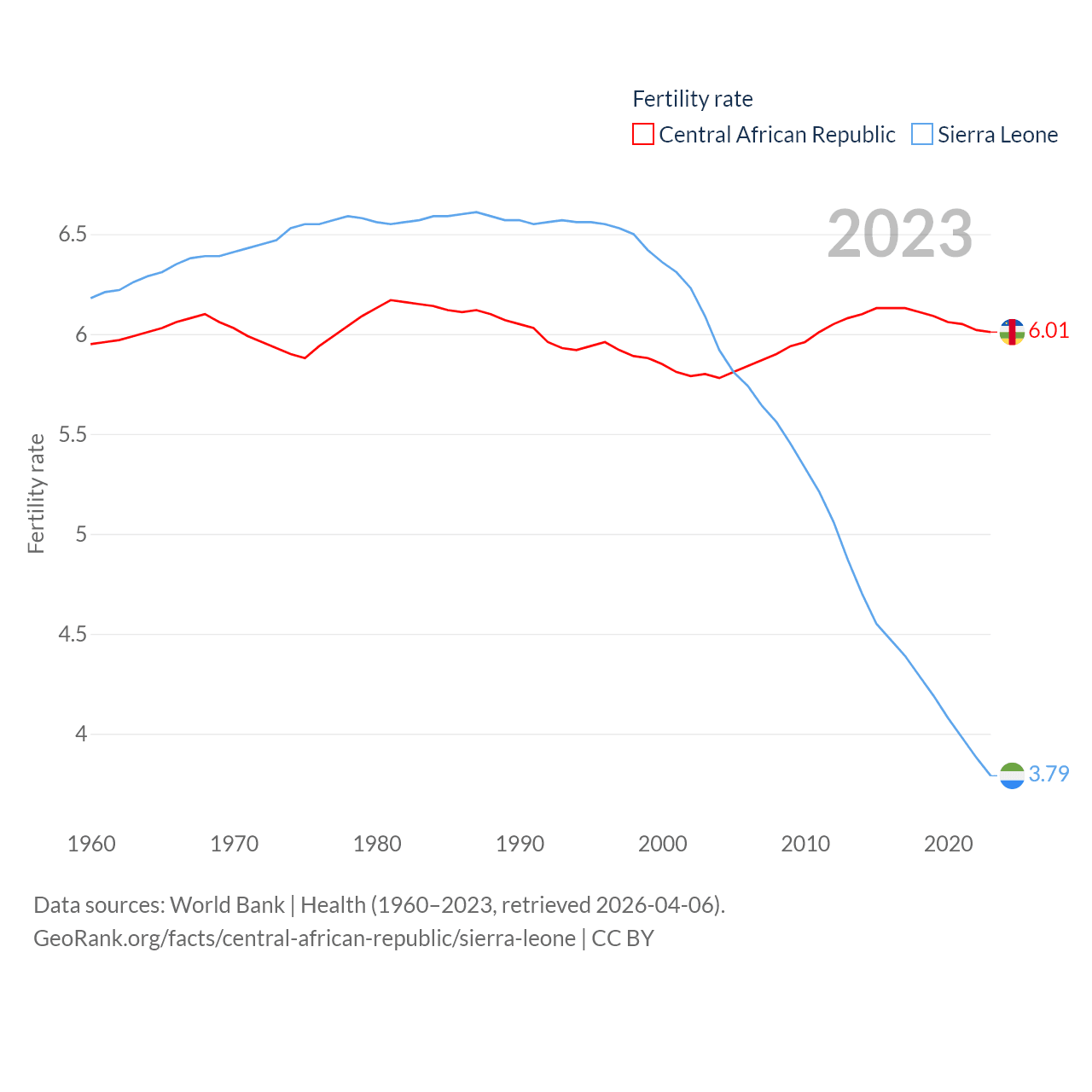 The Central African Republic has a population of 5.33M (ranked 121/197), compared with 8.64M in Sierra Leone (ranked 102/197). The Central African Republic's land area is 240,534 sq mi versus 27,869 sq mi for Sierra Leone (ranked 43rd vs. 116th).