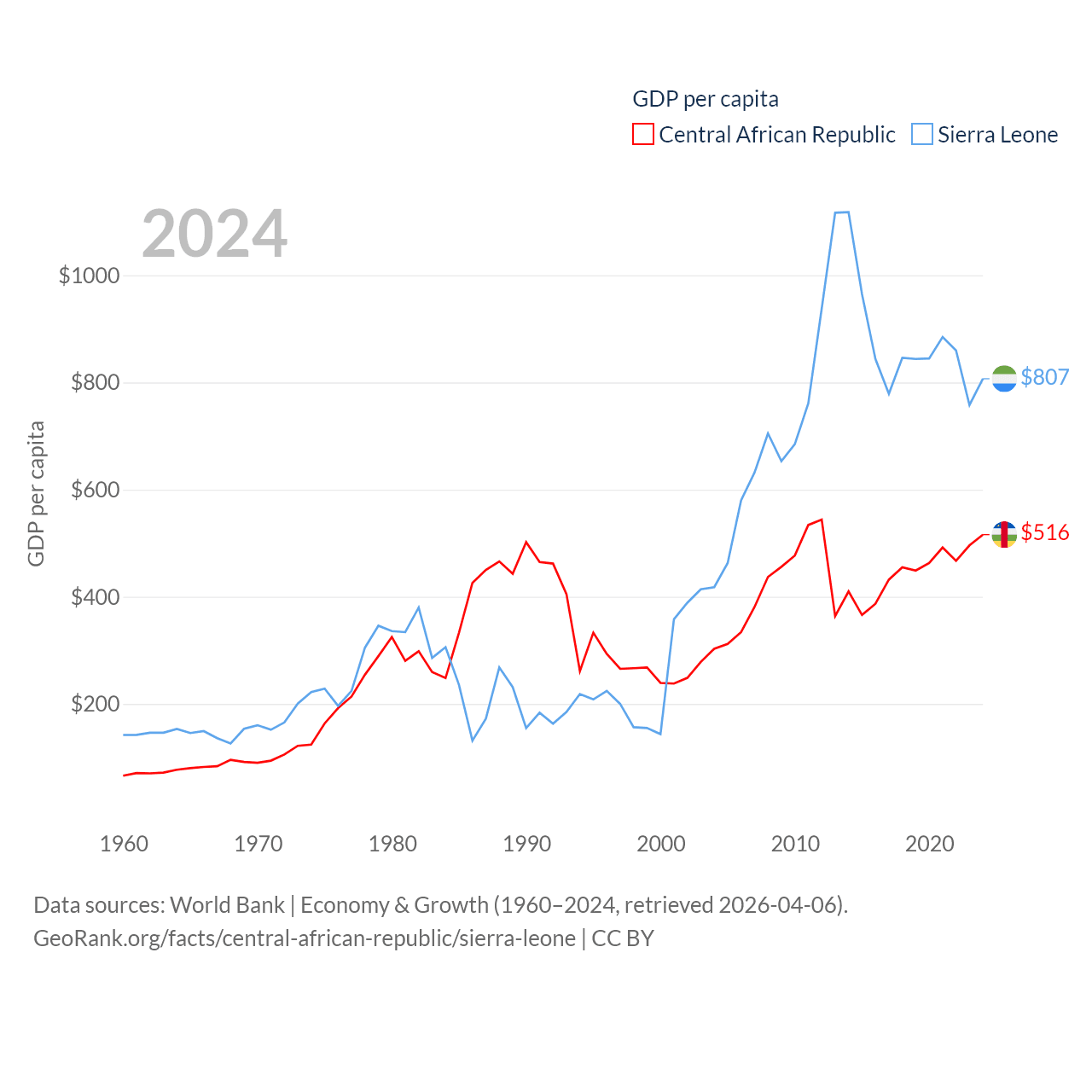 By GDP, The Central African Republic ranks 171/197 ($2.75B) and Sierra Leone ranks 160/197 ($6.97B). By GDP per capita, The Central African Republic ranks 195/197 ($516), while Sierra Leone ranks 186/197 ($807).