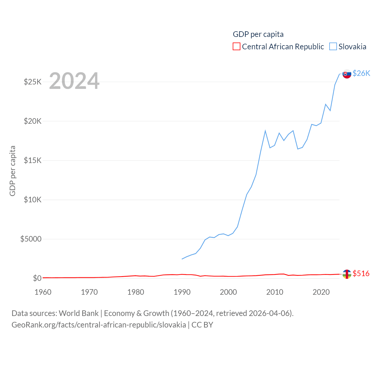 By GDP, The Central African Republic ranks 171/197 ($2.75B) and Slovakia ranks 61/197 ($141B). By GDP per capita, The Central African Republic ranks 195/197 ($516), while Slovakia ranks 47/197 ($25,993).