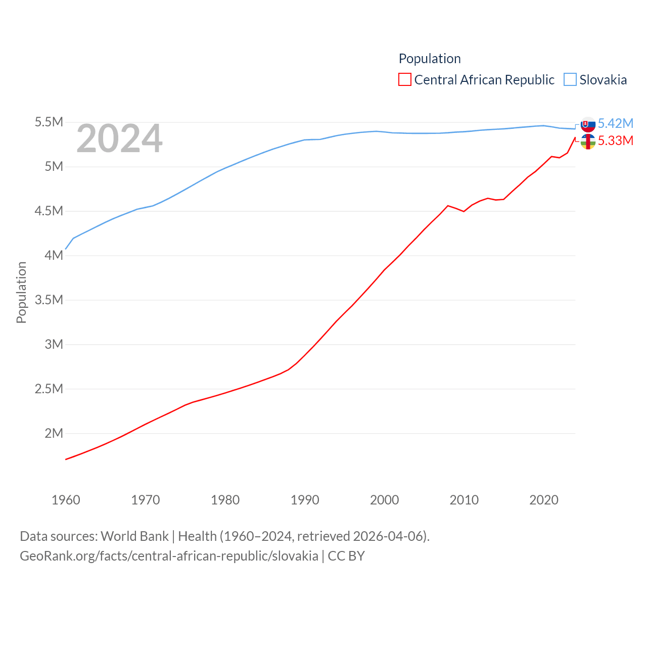 The Central African Republic has a population of 5.33M (ranked 121/197), compared with 5.42M in Slovakia (ranked 119/197). The Central African Republic's land area is 240,534 sq mi versus 18,564 sq mi for Slovakia (ranked 43rd vs. 128th).