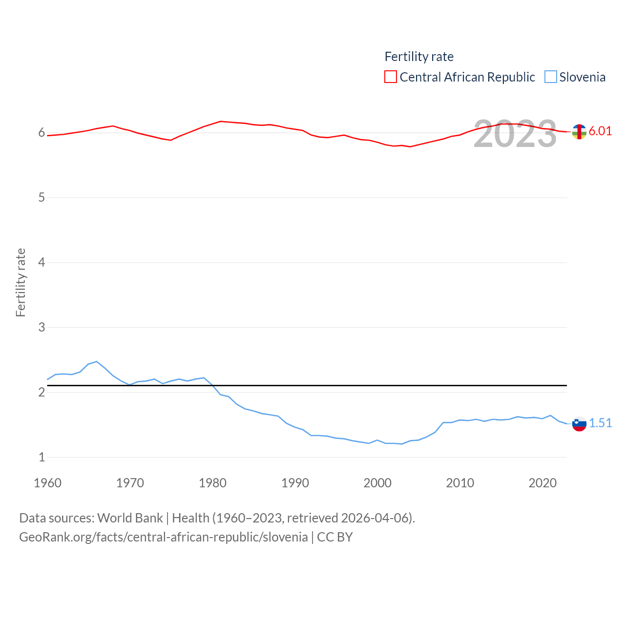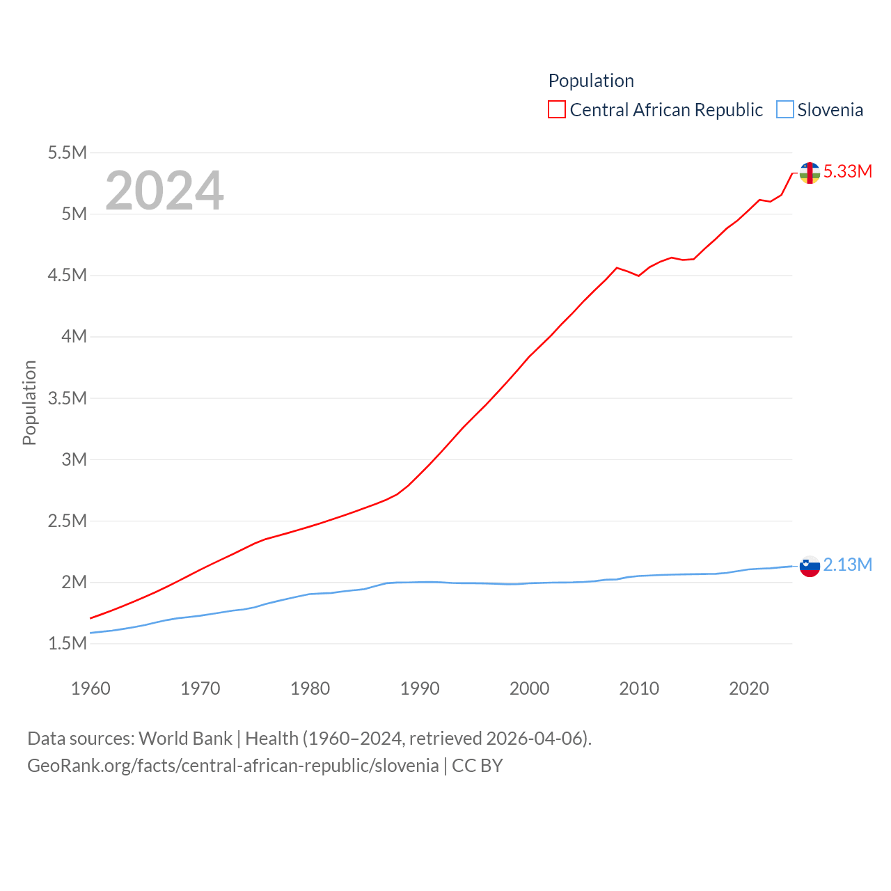 The Central African Republic has a population of 5.33M (ranked 121/197), compared with 2.13M in Slovenia (ranked 147/197). The Central African Republic's land area is 240,534 sq mi versus 7,774 sq mi for Slovenia (ranked 43rd vs. 151st).