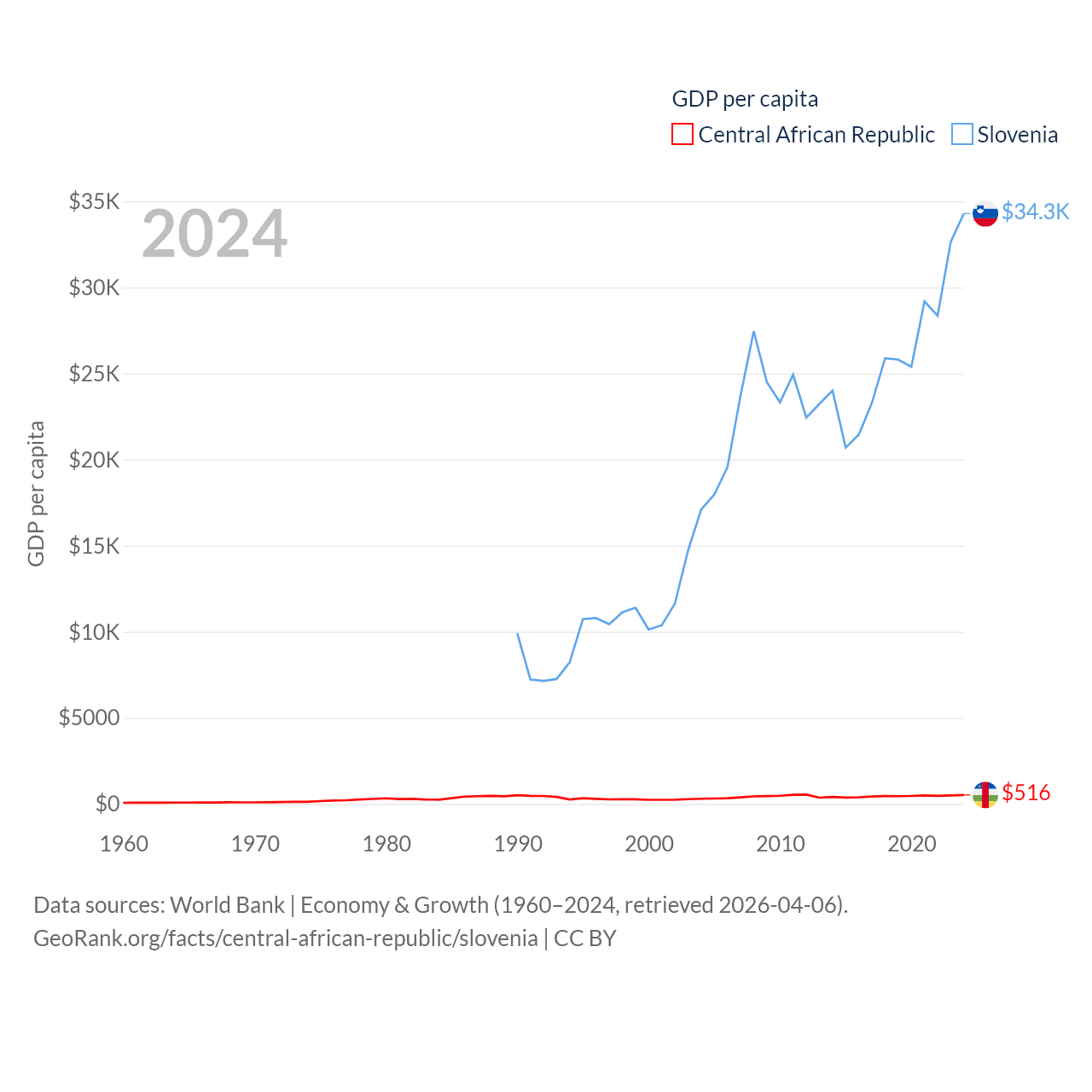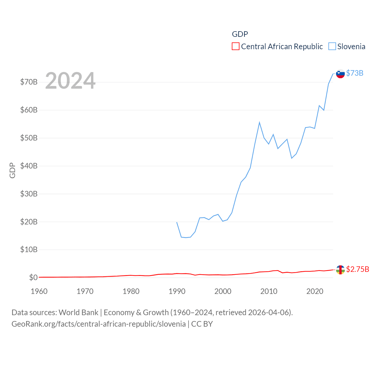 By GDP, The Central African Republic ranks 171/197 ($2.75B) and Slovenia ranks 86/197 ($73B). By GDP per capita, The Central African Republic ranks 195/197 ($516), while Slovenia ranks 34/197 ($34,301).