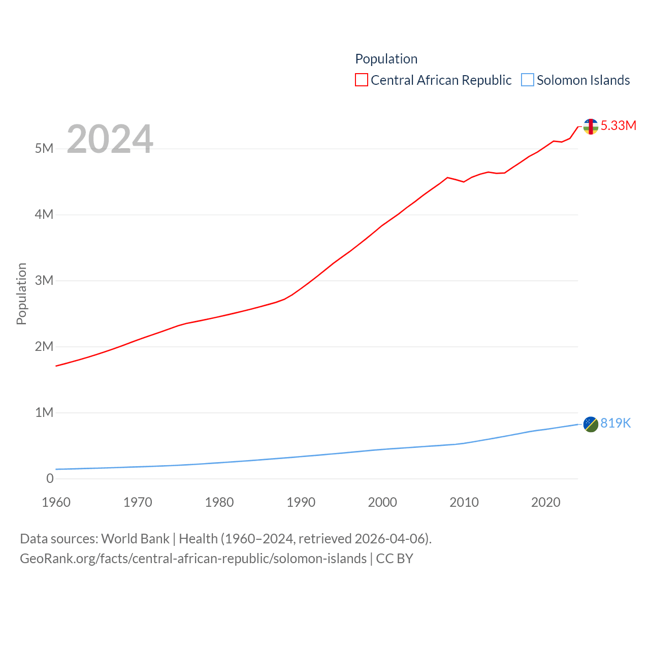 The Central African Republic has a population of 5.33M (ranked 121/197), compared with 819K in The Solomon Islands (ranked 162/197). The Central African Republic's land area is 240,534 sq mi versus 10,807 sq mi for The Solomon Islands (ranked 43rd vs. 141st).