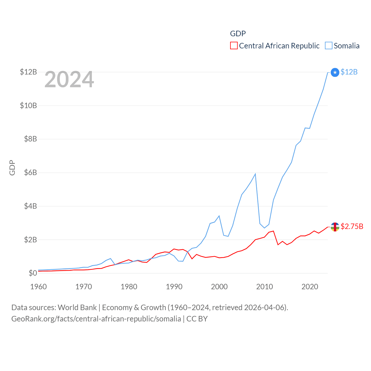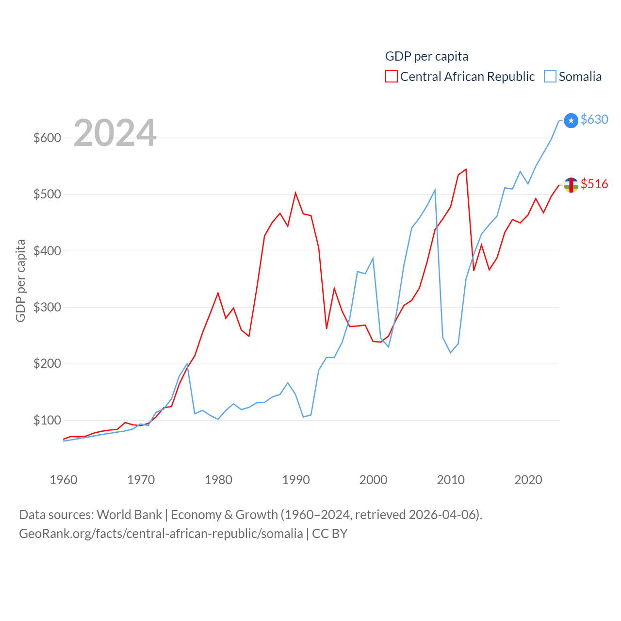 By GDP, The Central African Republic ranks 171/197 ($2.75B) and Somalia ranks 150/197 ($12B). By GDP per capita, The Central African Republic ranks 195/197 ($516), while Somalia ranks 192/197 ($630).