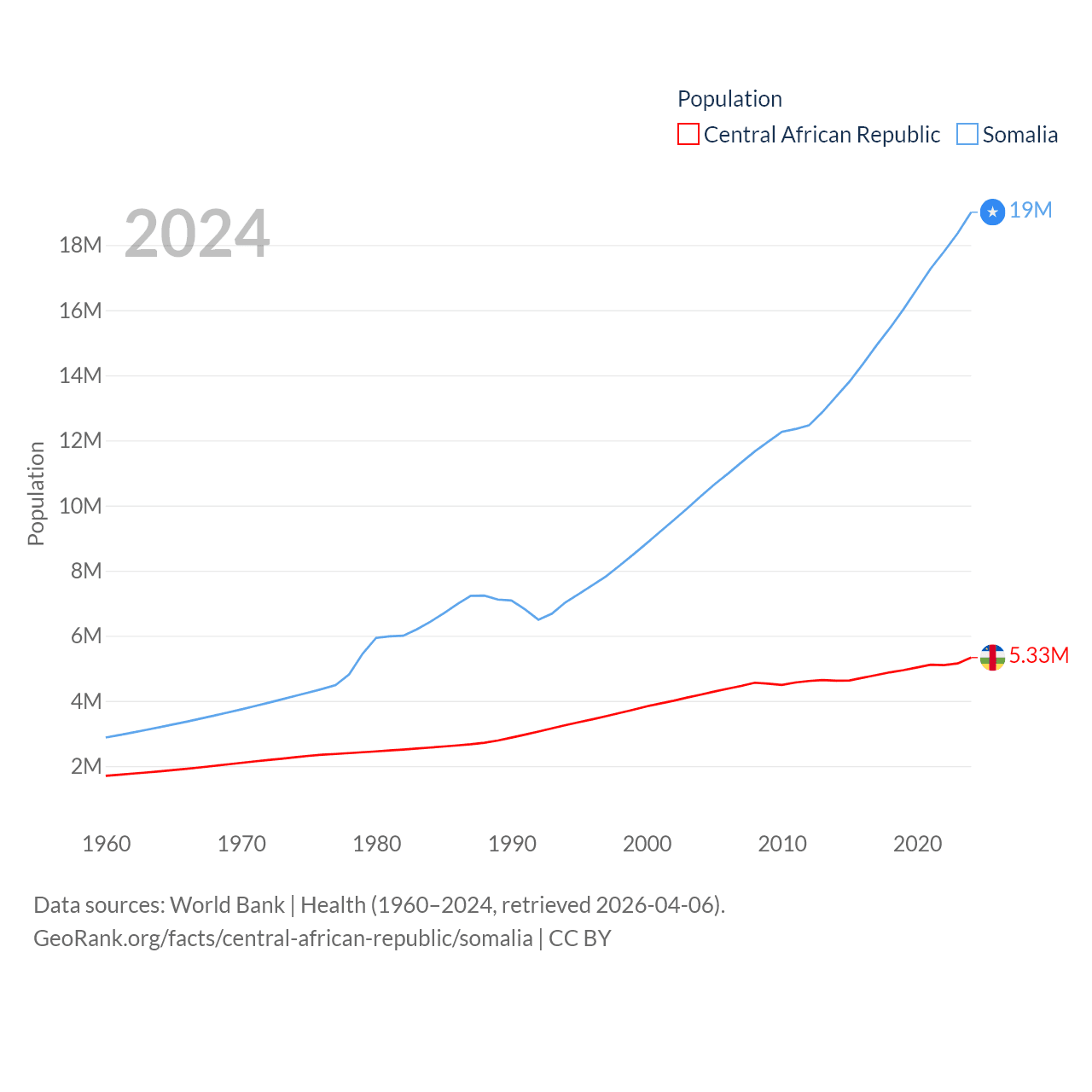The Central African Republic has a population of 5.33M (ranked 121/197), compared with 19M in Somalia (ranked 68/197). The Central African Republic's land area is 240,534 sq mi versus 242,217 sq mi for Somalia (ranked 43rd vs. 42nd).