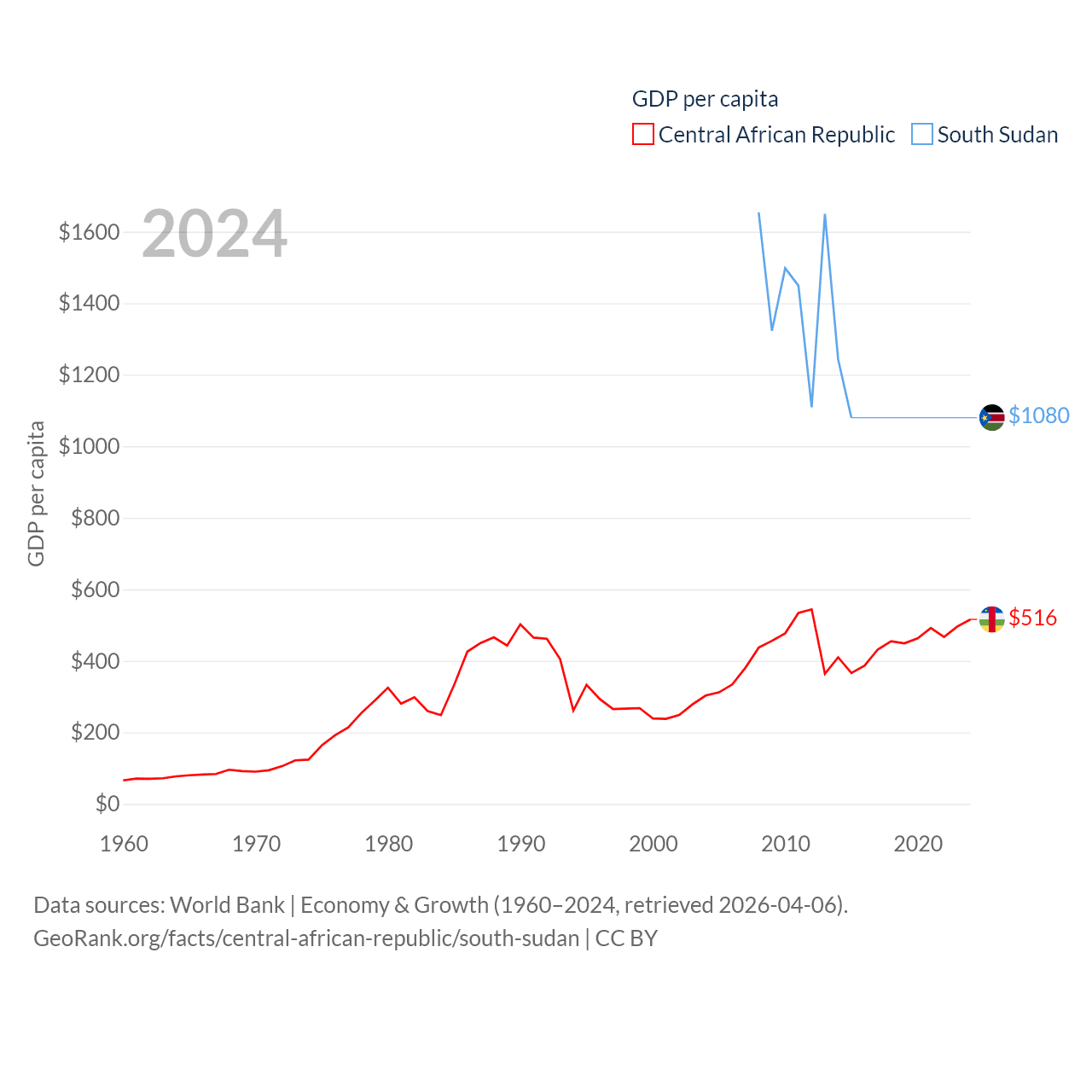 By GDP, The Central African Republic ranks 171/197 ($2.75B) and South Sudan ranks 149/197 ($12B). By GDP per capita, The Central African Republic ranks 195/197 ($516), while South Sudan ranks 175/197 ($1,080).