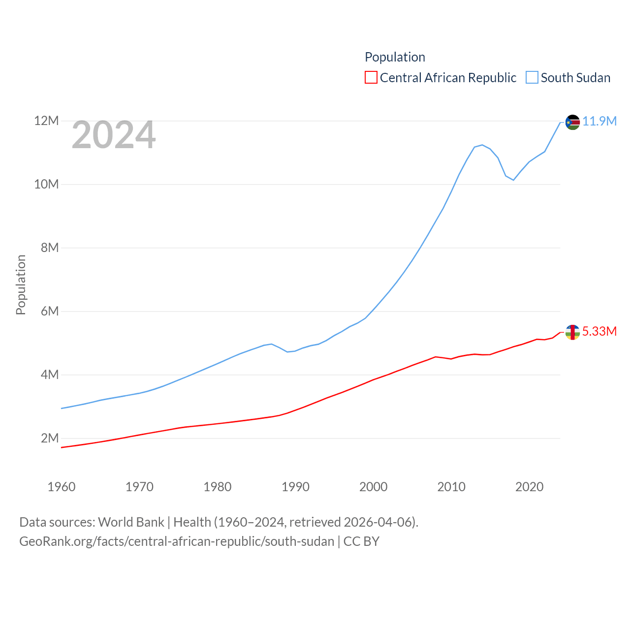 The Central African Republic has a population of 5.33M (ranked 121/197), compared with 11.9M in South Sudan (ranked 81/197). The Central African Republic's land area is 240,534 sq mi versus 243,990 sq mi for South Sudan (ranked 43rd vs. 41st).