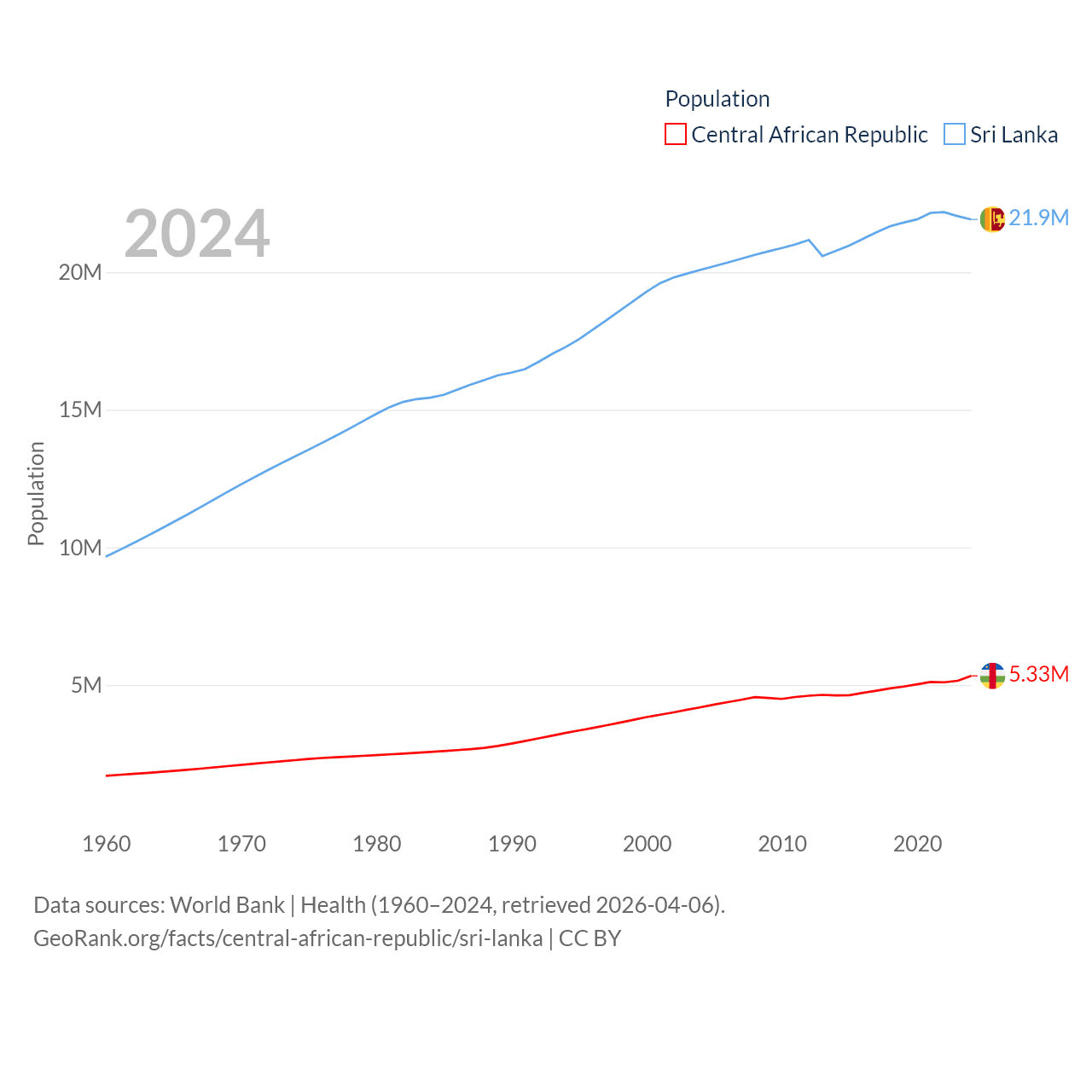 The Central African Republic has a population of 5.33M (ranked 121/197), compared with 21.9M in Sri Lanka (ranked 61/197). The Central African Republic's land area is 240,534 sq mi versus 23,884 sq mi for Sri Lanka (ranked 43rd vs. 122nd).