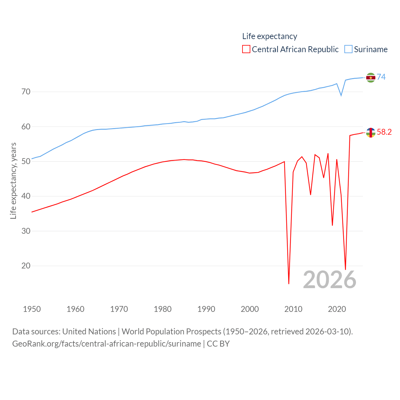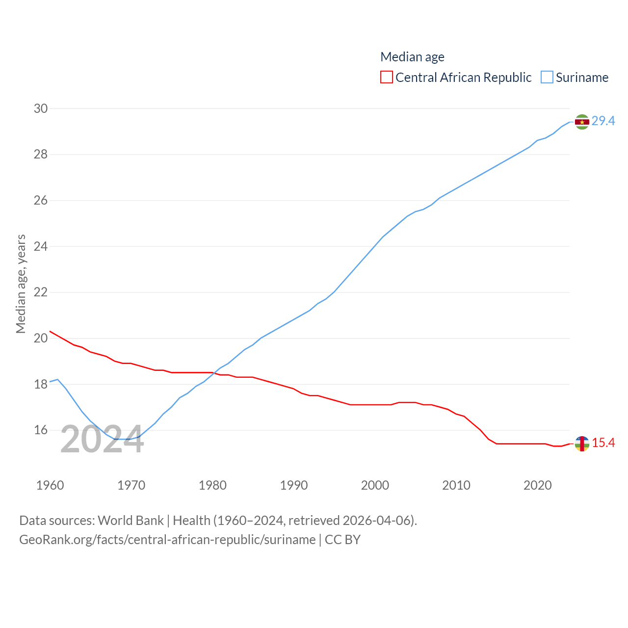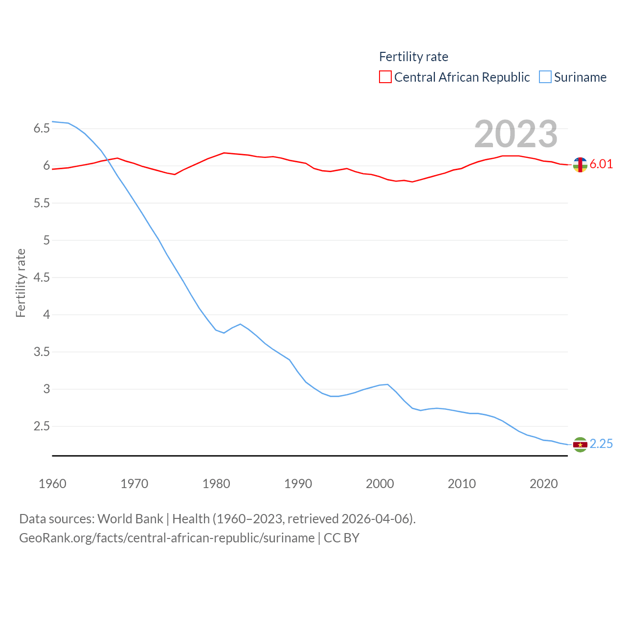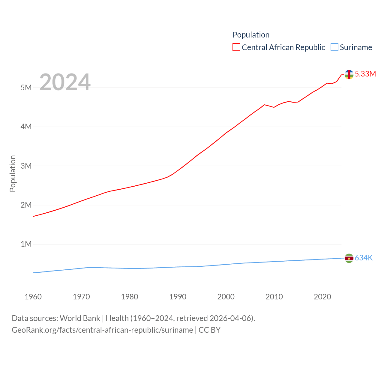 The Central African Republic has a population of 5.33M (ranked 121/197), compared with 634K in Suriname (ranked 165/197). The Central African Republic's land area is 240,534 sq mi versus 61,972 sq mi for Suriname (ranked 43rd vs. 90th).