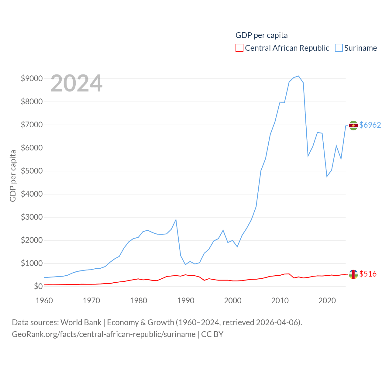 By GDP, The Central African Republic ranks 171/197 ($2.75B) and Suriname ranks 164/197 ($4.42B). By GDP per capita, The Central African Republic ranks 195/197 ($516), while Suriname ranks 102/197 ($6,962).
