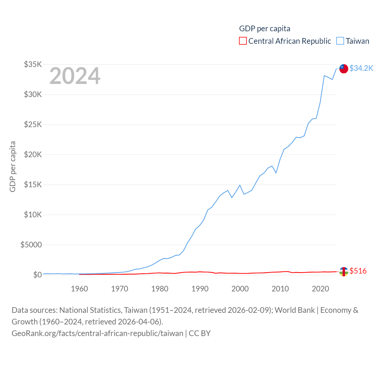 By GDP, The Central African Republic ranks 171/197 ($2.75B) and Taiwan ranks 22/197 ($802B). By GDP per capita, The Central African Republic ranks 195/197 ($516), while Taiwan ranks 35/197 ($34,238).