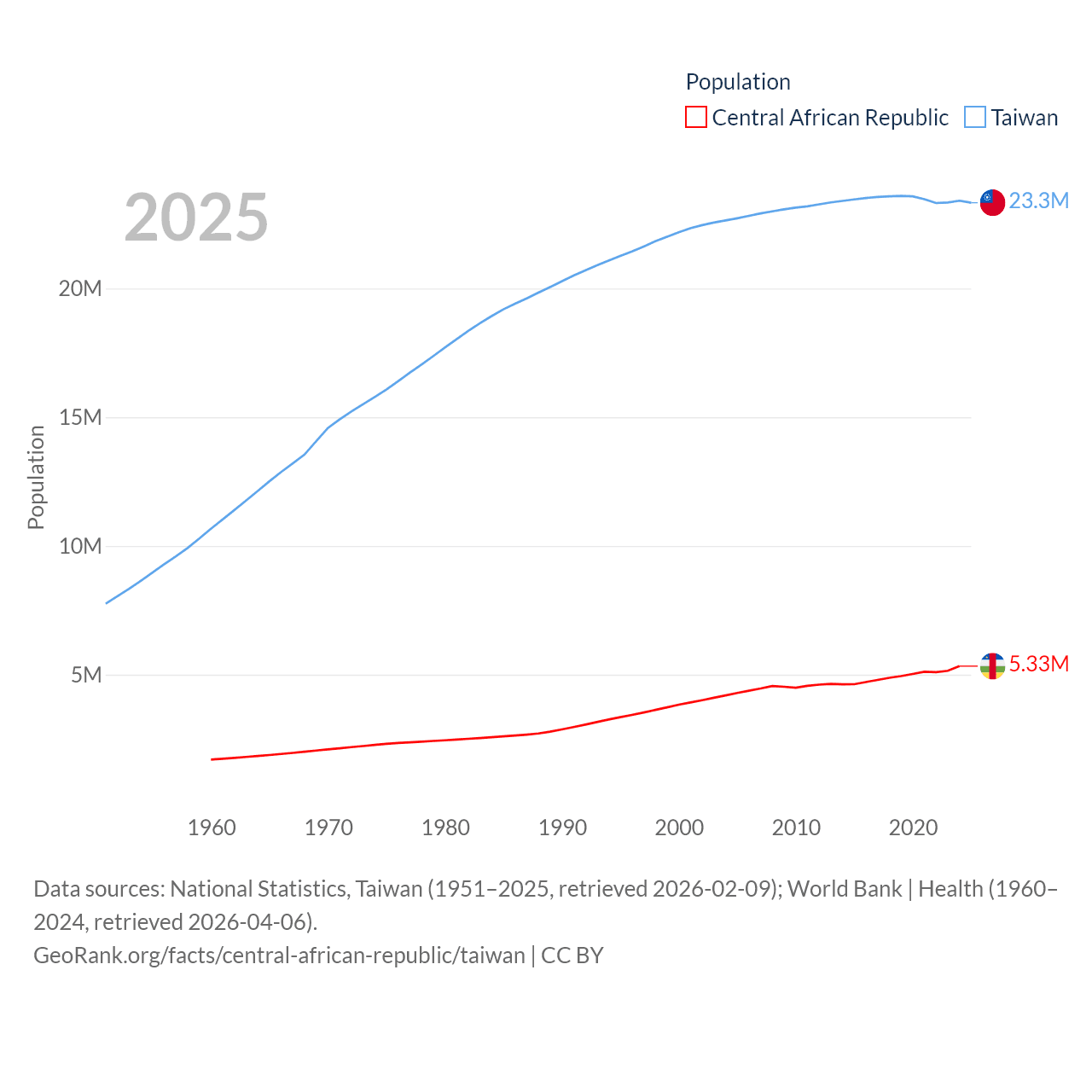 The Central African Republic has a population of 5.33M (ranked 121/197), compared with 23.3M in Taiwan (ranked 60/197). The Central African Republic's land area is 240,534 sq mi versus 13,976 sq mi for Taiwan (ranked 43rd vs. 133rd).