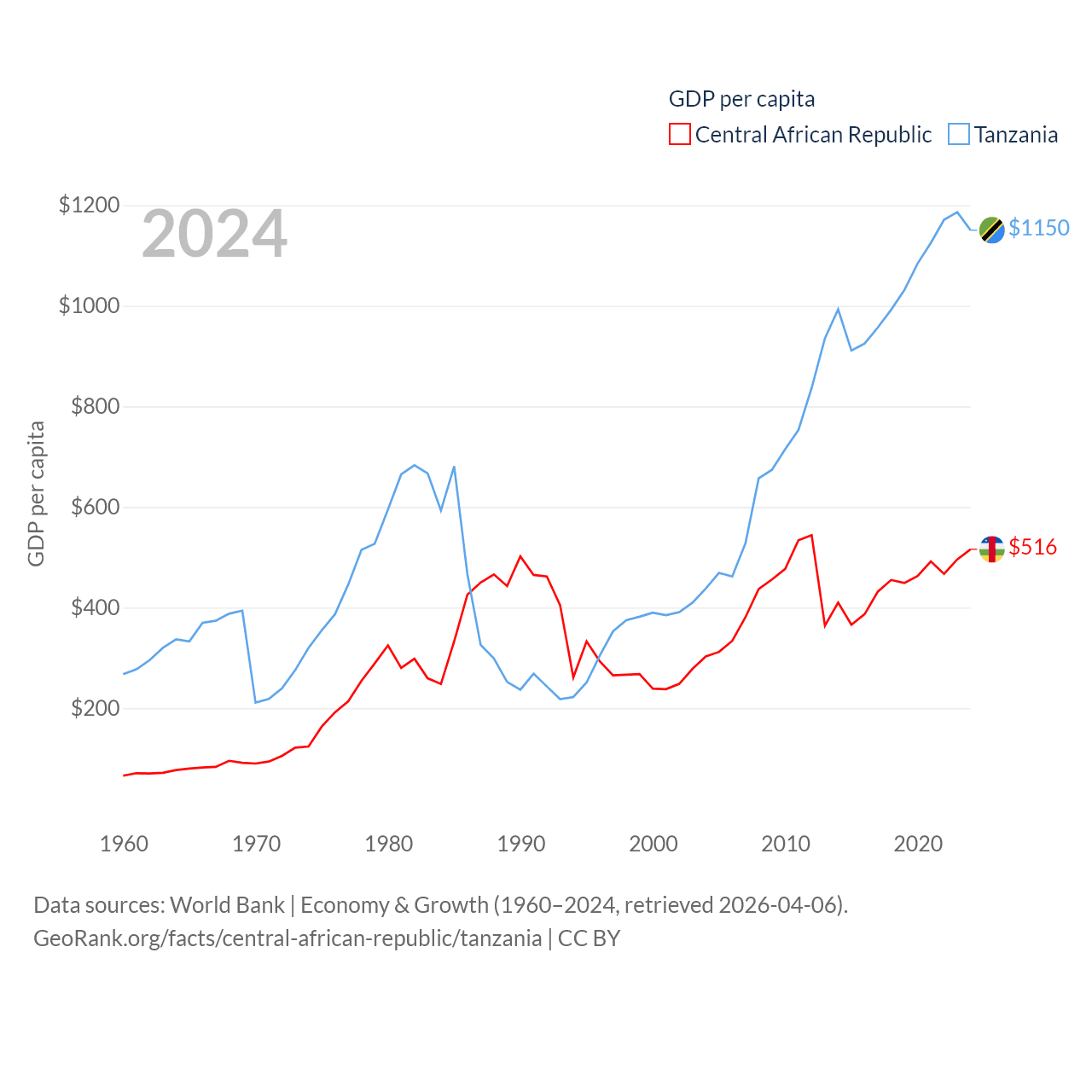 By GDP, The Central African Republic ranks 171/197 ($2.75B) and Tanzania ranks 82/197 ($78.8B). By GDP per capita, The Central African Republic ranks 195/197 ($516), while Tanzania ranks 170/197 ($1,150).