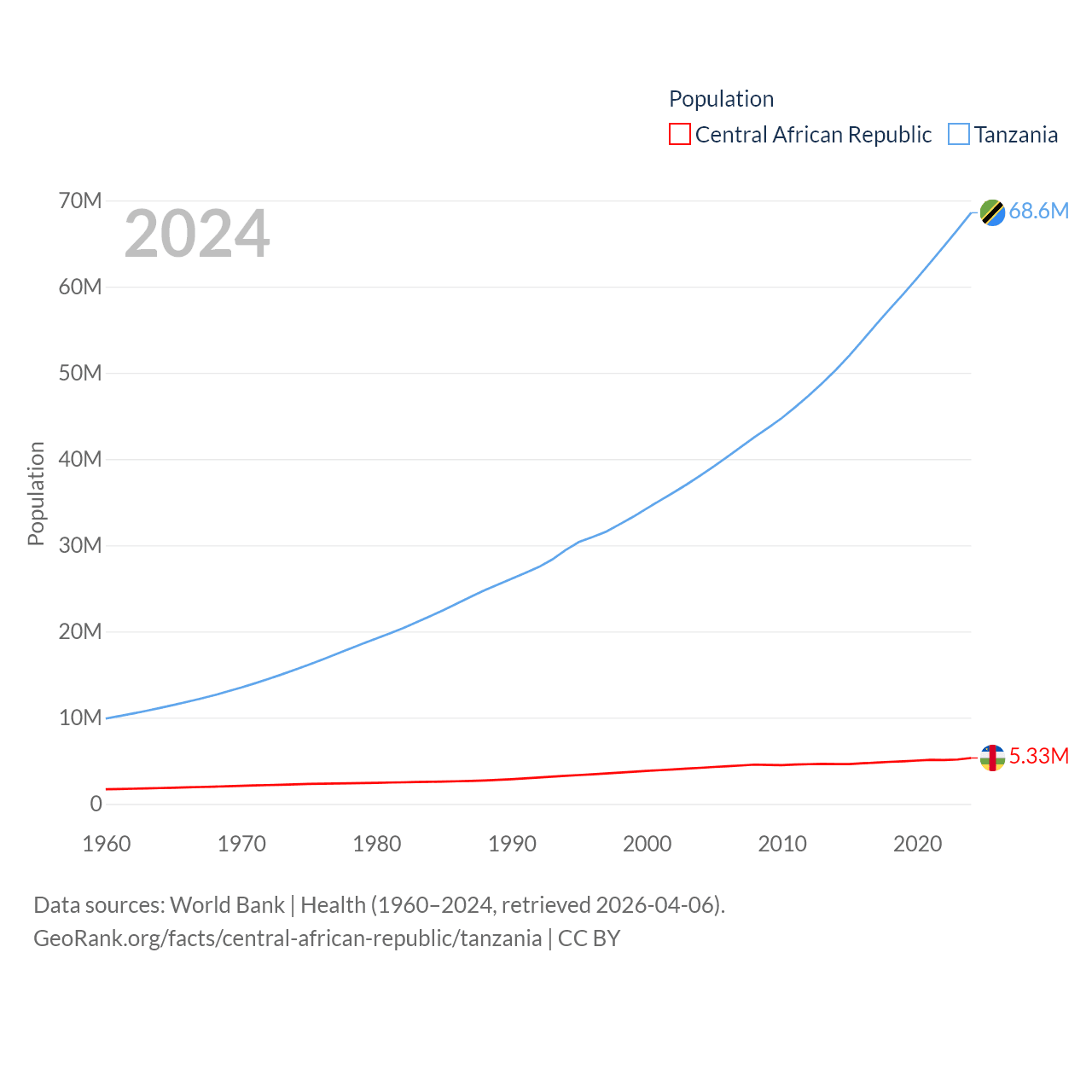 The Central African Republic has a population of 5.33M (ranked 121/197), compared with 68.6M in Tanzania (ranked 22/197). The Central African Republic's land area is 240,534 sq mi versus 342,009 sq mi for Tanzania (ranked 43rd vs. 31st).