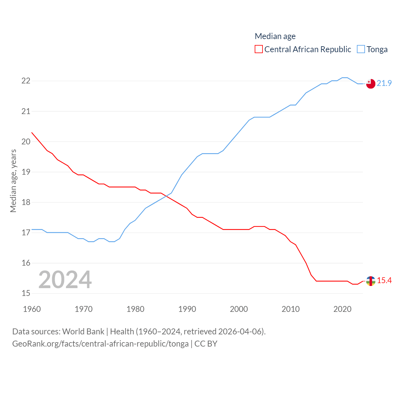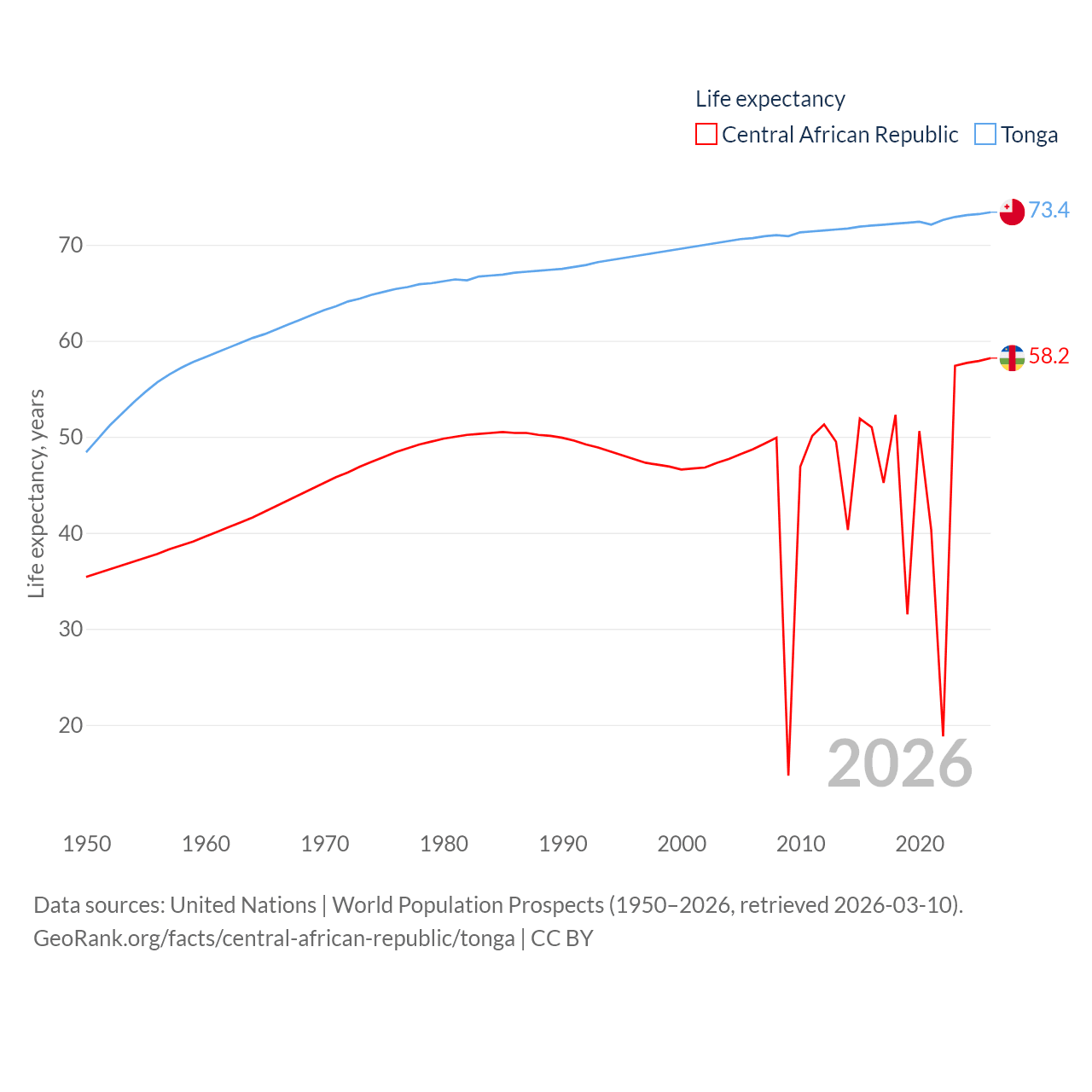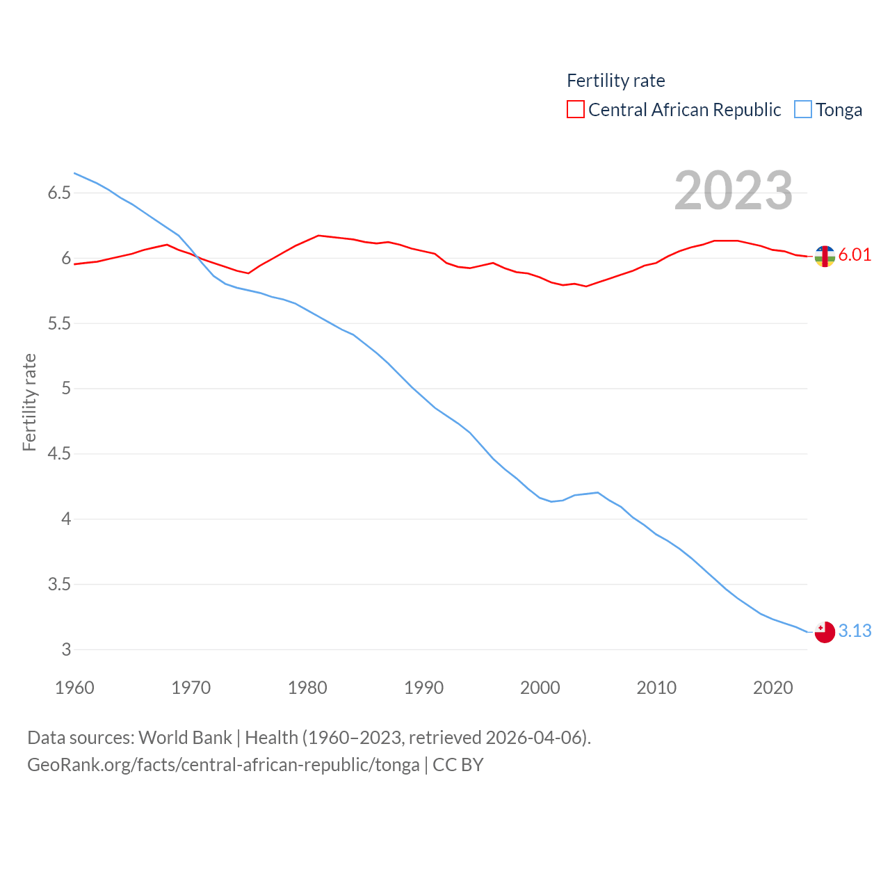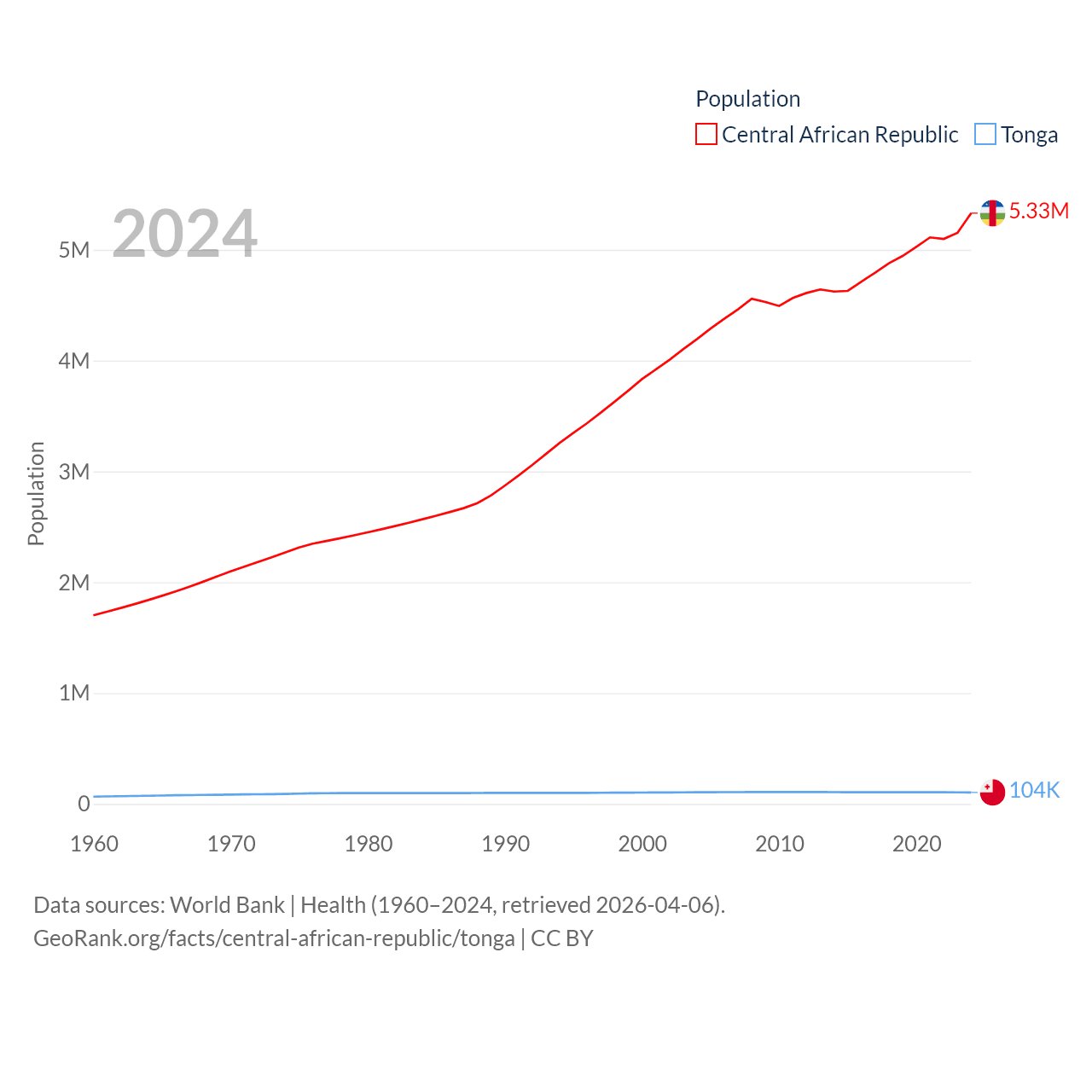 The Central African Republic has a population of 5.33M (ranked 121/197), compared with 104K in Tonga (ranked 183/197). The Central African Republic's land area is 240,534 sq mi versus 278 sq mi for Tonga (ranked 43rd vs. 176th).