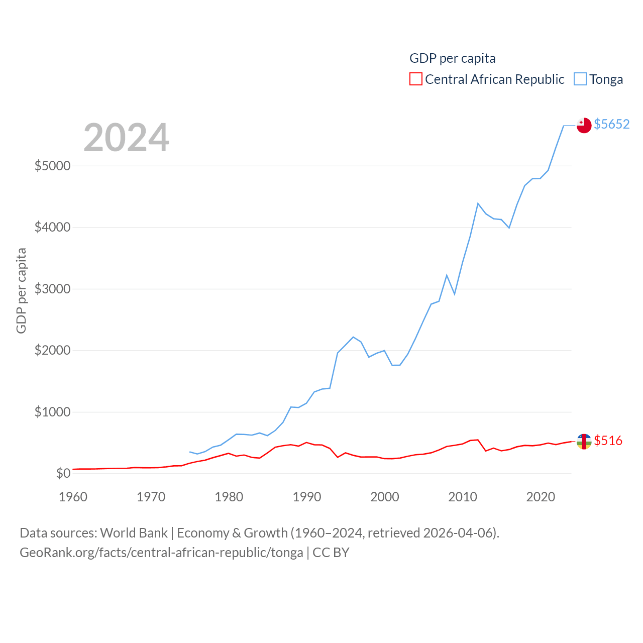 By GDP, The Central African Republic ranks 171/197 ($2.75B) and Tonga ranks 191/197 ($591M). By GDP per capita, The Central African Republic ranks 195/197 ($516), while Tonga ranks 115/197 ($5,652).