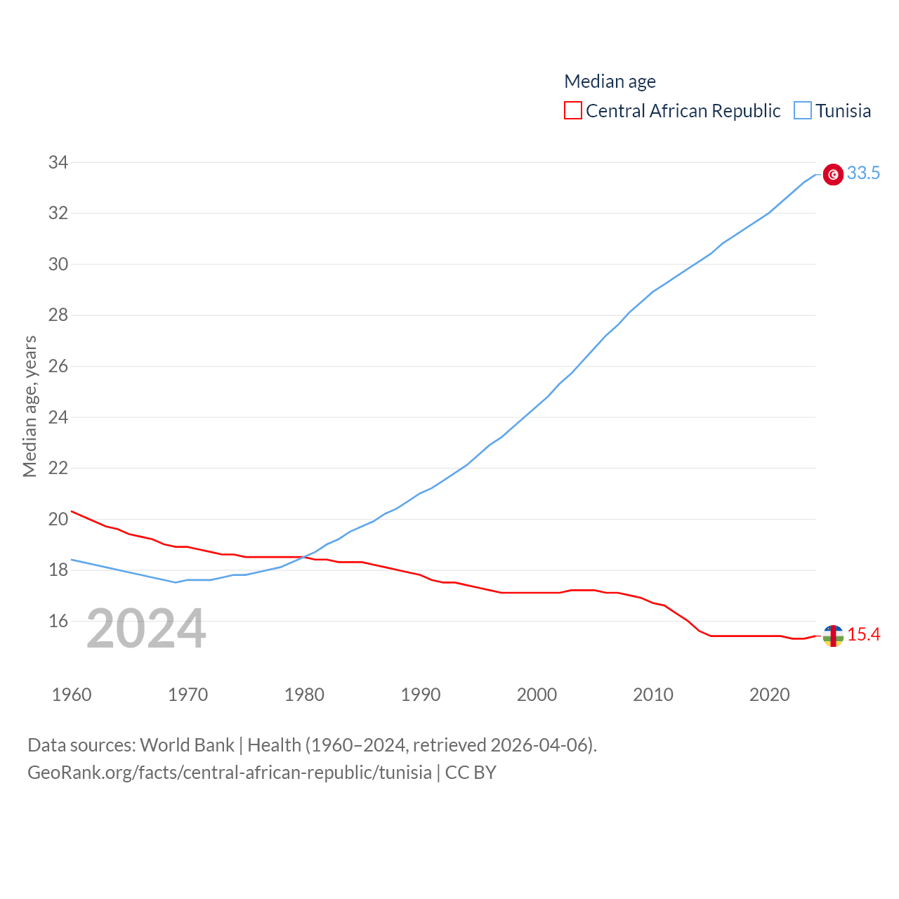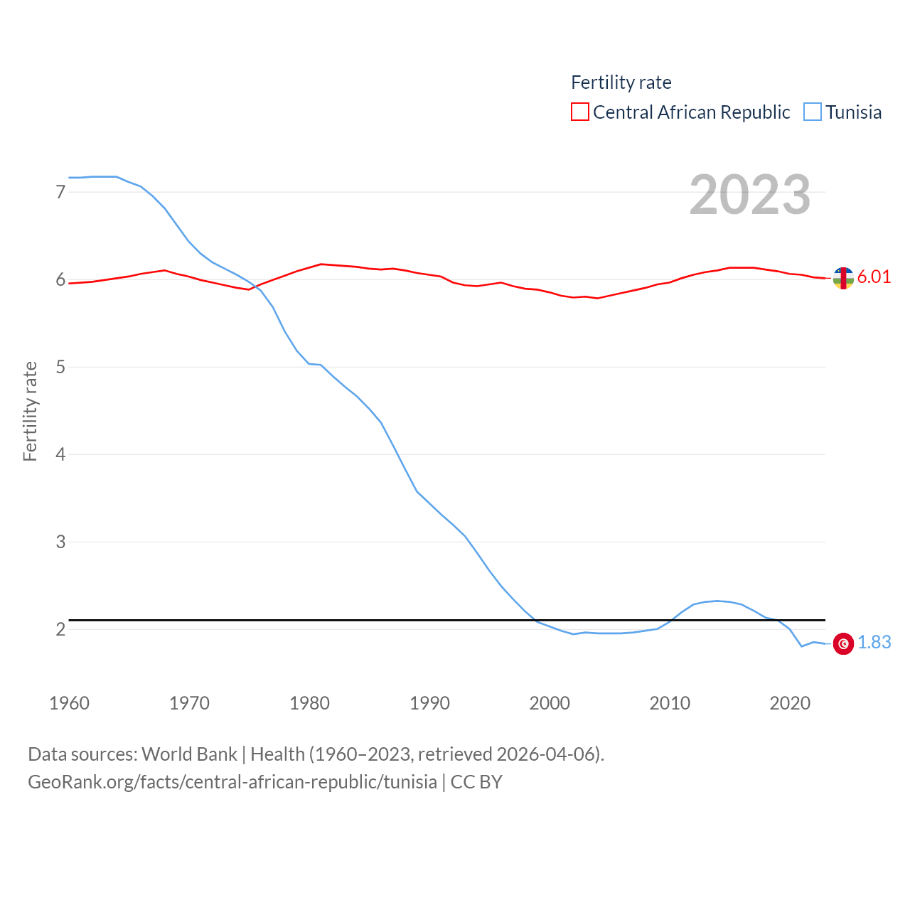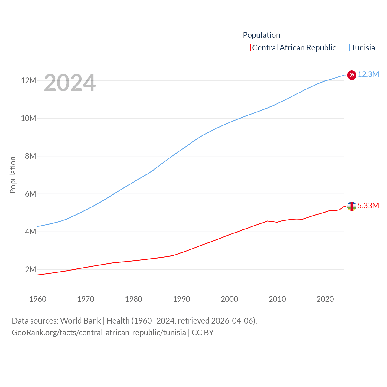 The Central African Republic has a population of 5.33M (ranked 121/197), compared with 12.3M in Tunisia (ranked 80/197). The Central African Republic's land area is 240,534 sq mi versus 59,985 sq mi for Tunisia (ranked 43rd vs. 91st).
