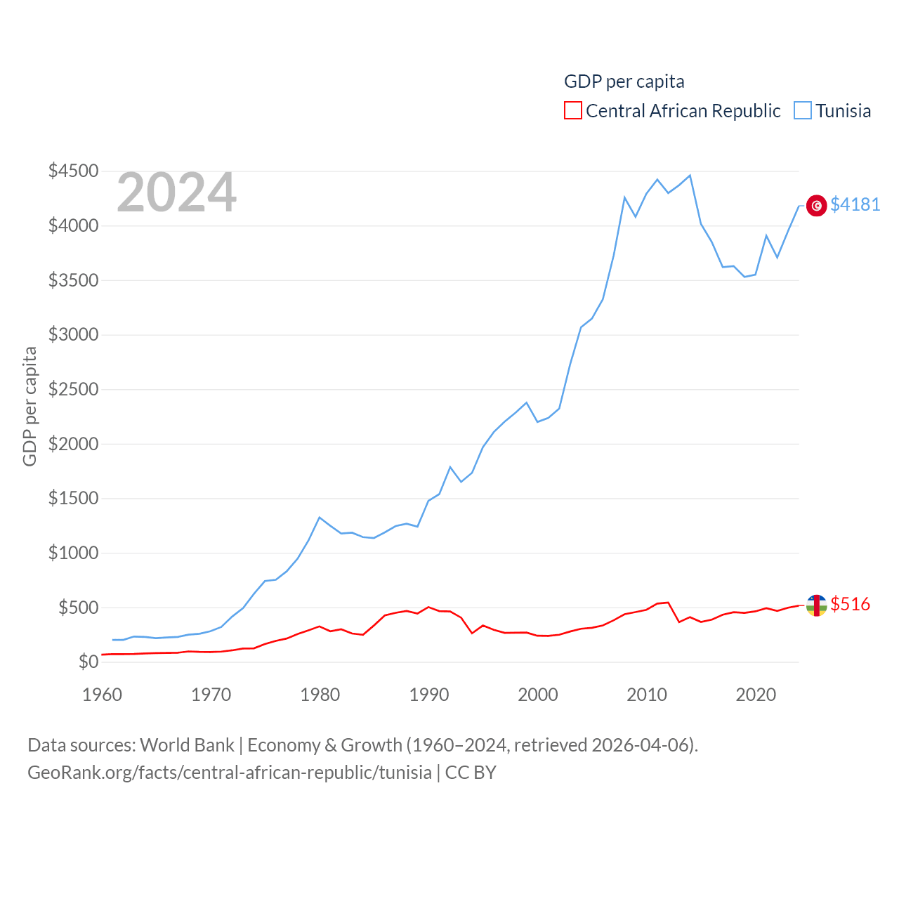 By GDP, The Central African Republic ranks 171/197 ($2.75B) and Tunisia ranks 93/197 ($51.3B). By GDP per capita, The Central African Republic ranks 195/197 ($516), while Tunisia ranks 129/197 ($4,181).