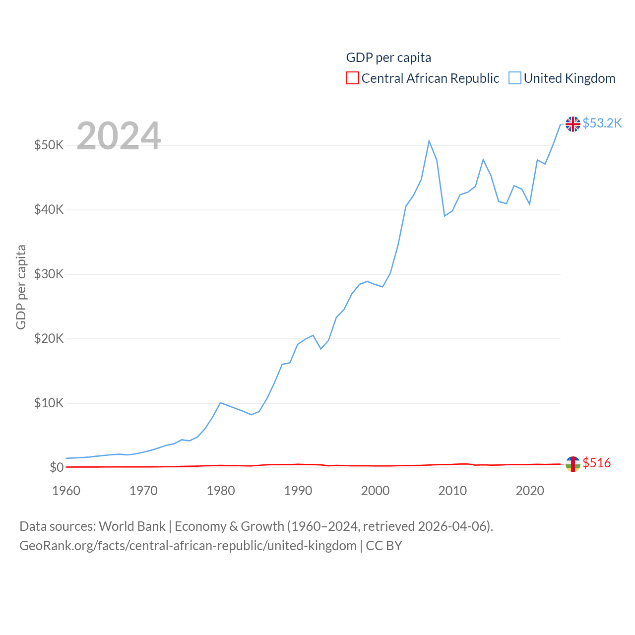 By GDP, The Central African Republic ranks 171/197 ($2.75B) and The United Kingdom ranks 6/197 ($3.69T). By GDP per capita, The Central African Republic ranks 195/197 ($516), while The United Kingdom ranks 22/197 ($53,246).