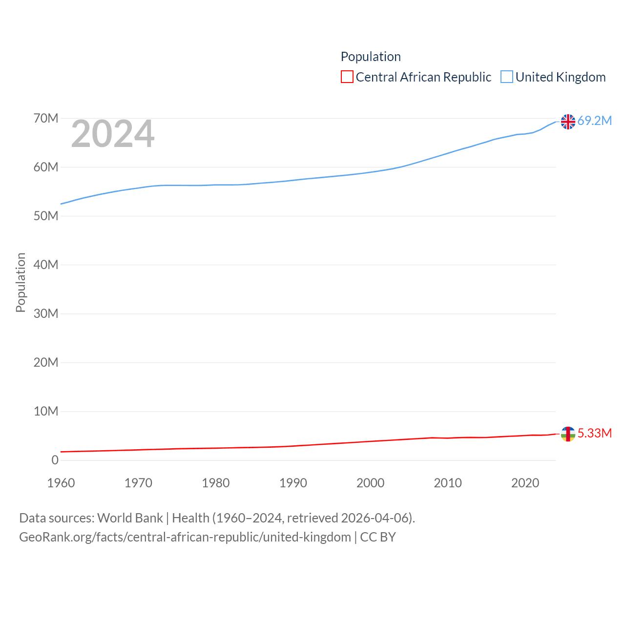 The Central African Republic has a population of 5.33M (ranked 121/197), compared with 69.2M in The United Kingdom (ranked 21/197). The Central African Republic's land area is 240,534 sq mi versus 93,410 sq mi for The United Kingdom (ranked 43rd vs. 78th).