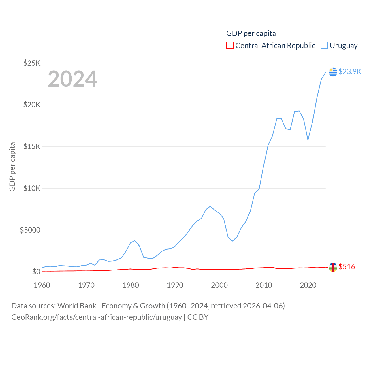 By GDP, The Central African Republic ranks 171/197 ($2.75B) and Uruguay ranks 81/197 ($81B). By GDP per capita, The Central African Republic ranks 195/197 ($516), while Uruguay ranks 52/197 ($23,907).