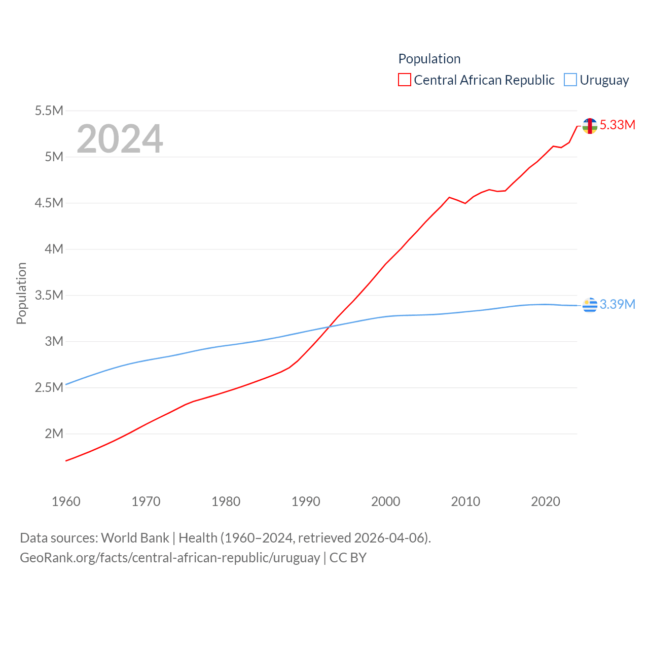 The Central African Republic has a population of 5.33M (ranked 121/197), compared with 3.39M in Uruguay (ranked 133/197). The Central African Republic's land area is 240,534 sq mi versus 67,576 sq mi for Uruguay (ranked 43rd vs. 89th).