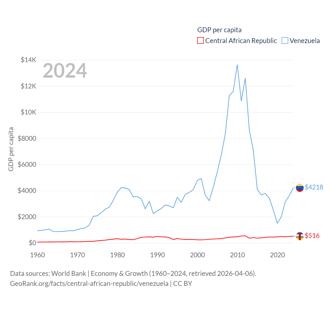 By GDP, The Central African Republic ranks 171/197 ($2.75B) and Venezuela ranks 65/197 ($120B). By GDP per capita, The Central African Republic ranks 195/197 ($516), while Venezuela ranks 128/197 ($4,218).