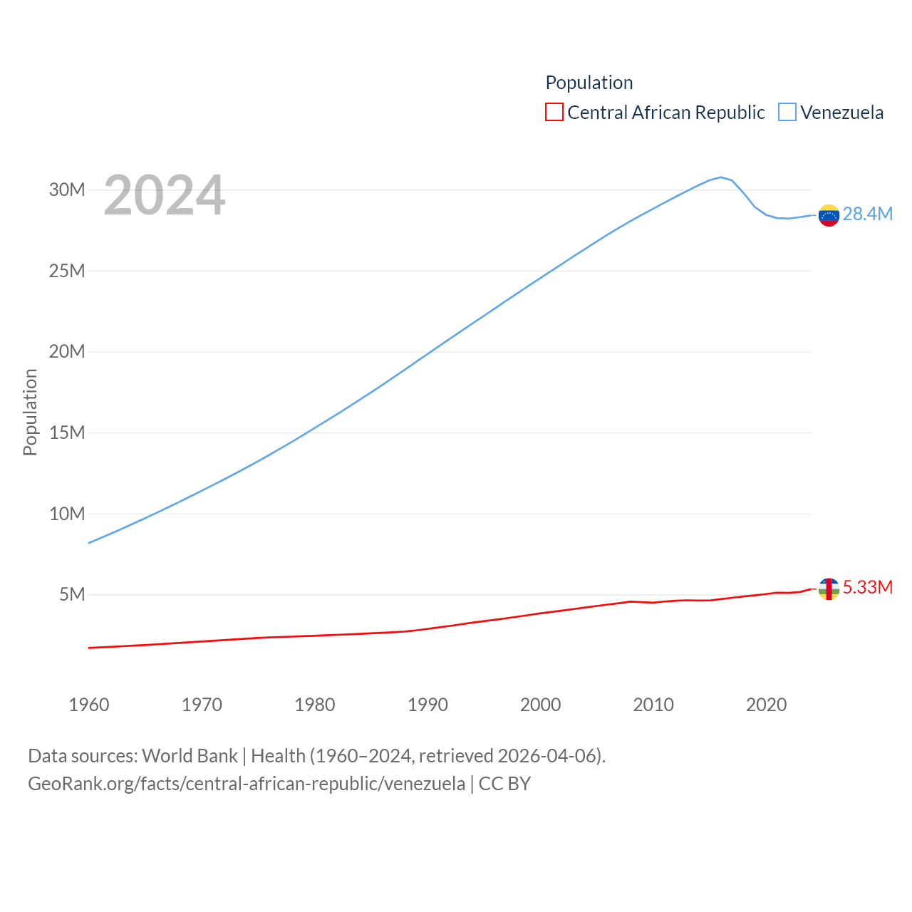 The Central African Republic has a population of 5.33M (ranked 121/197), compared with 28.4M in Venezuela (ranked 53/197). The Central African Republic's land area is 240,534 sq mi versus 340,561 sq mi for Venezuela (ranked 43rd vs. 32nd).